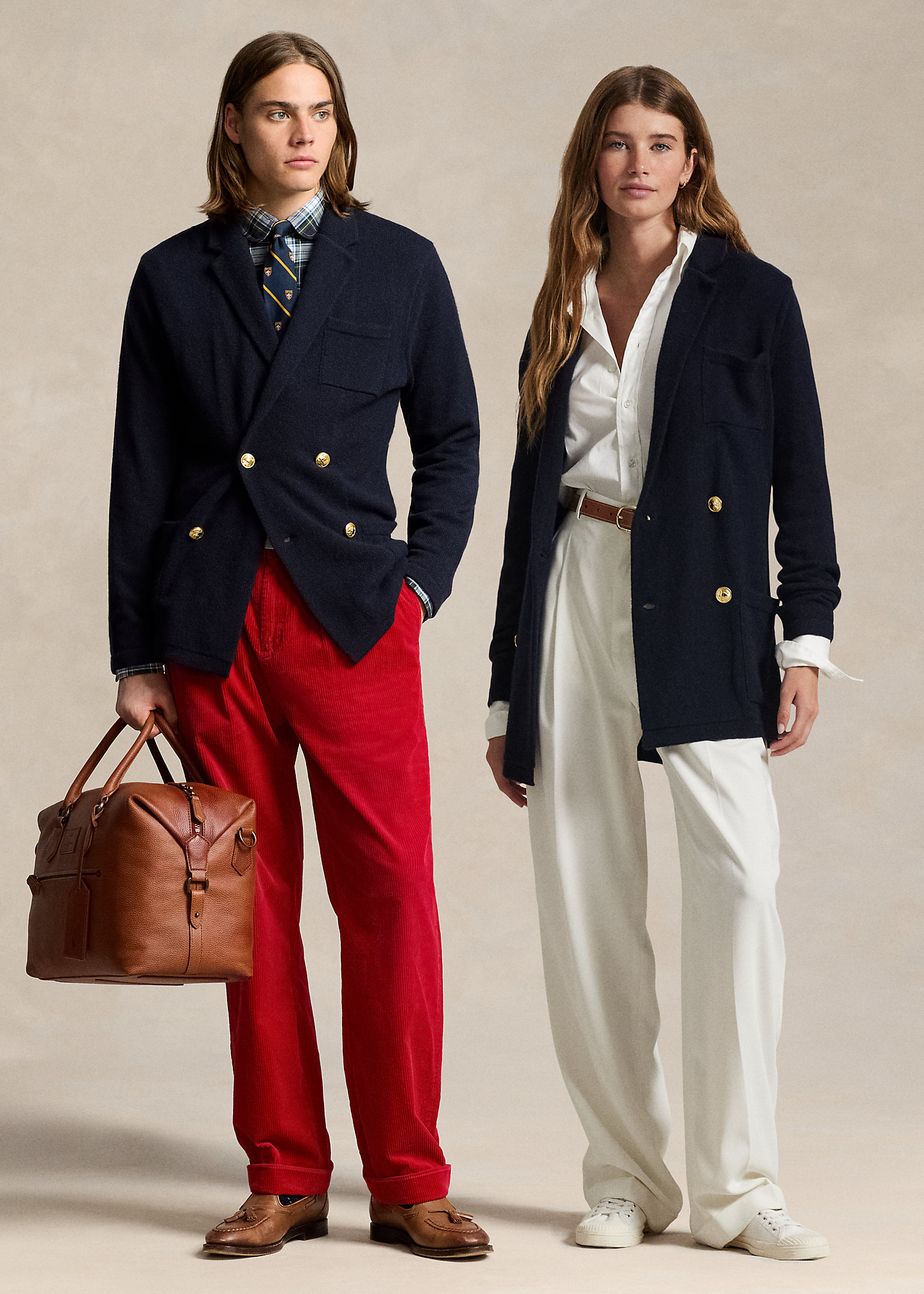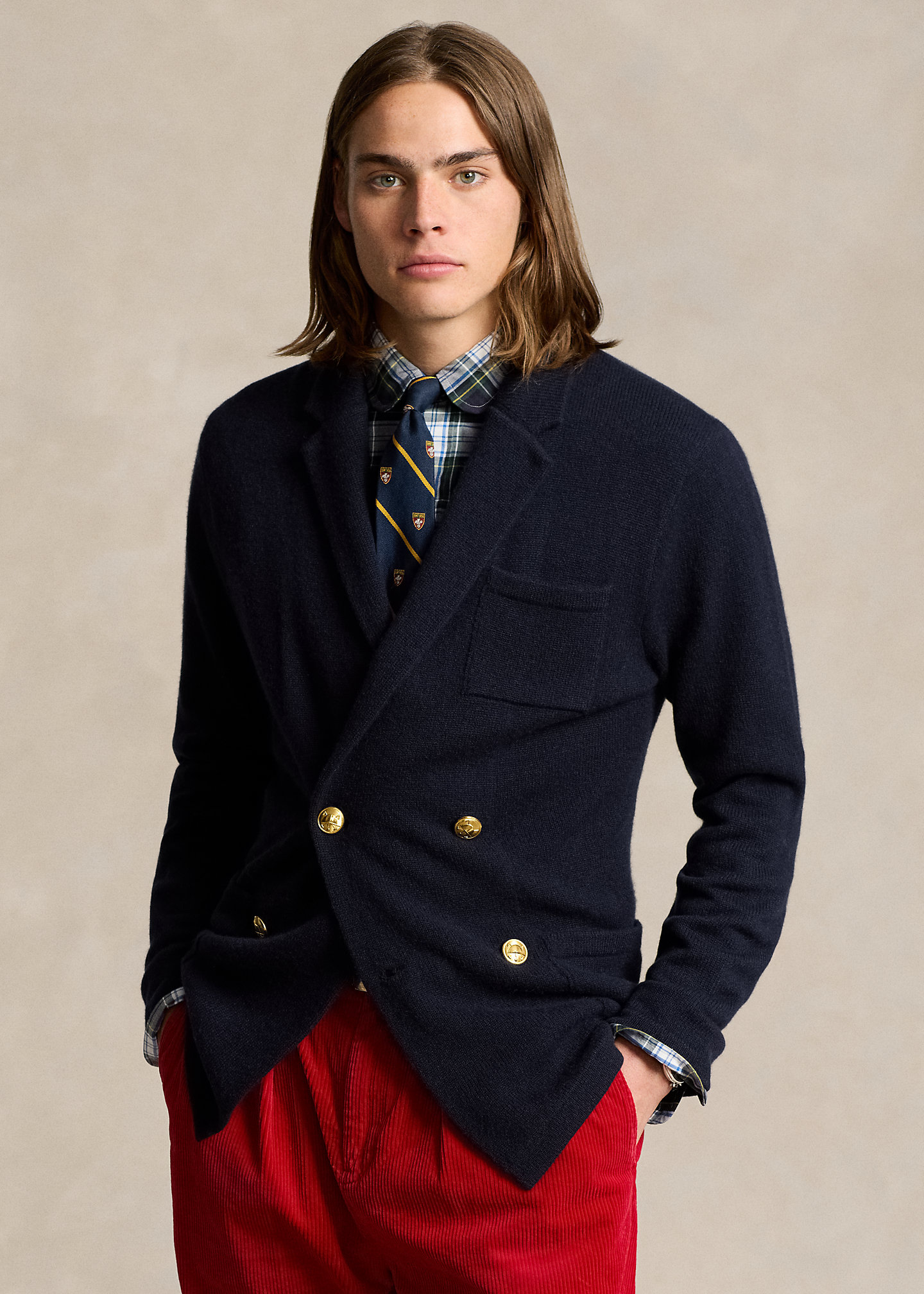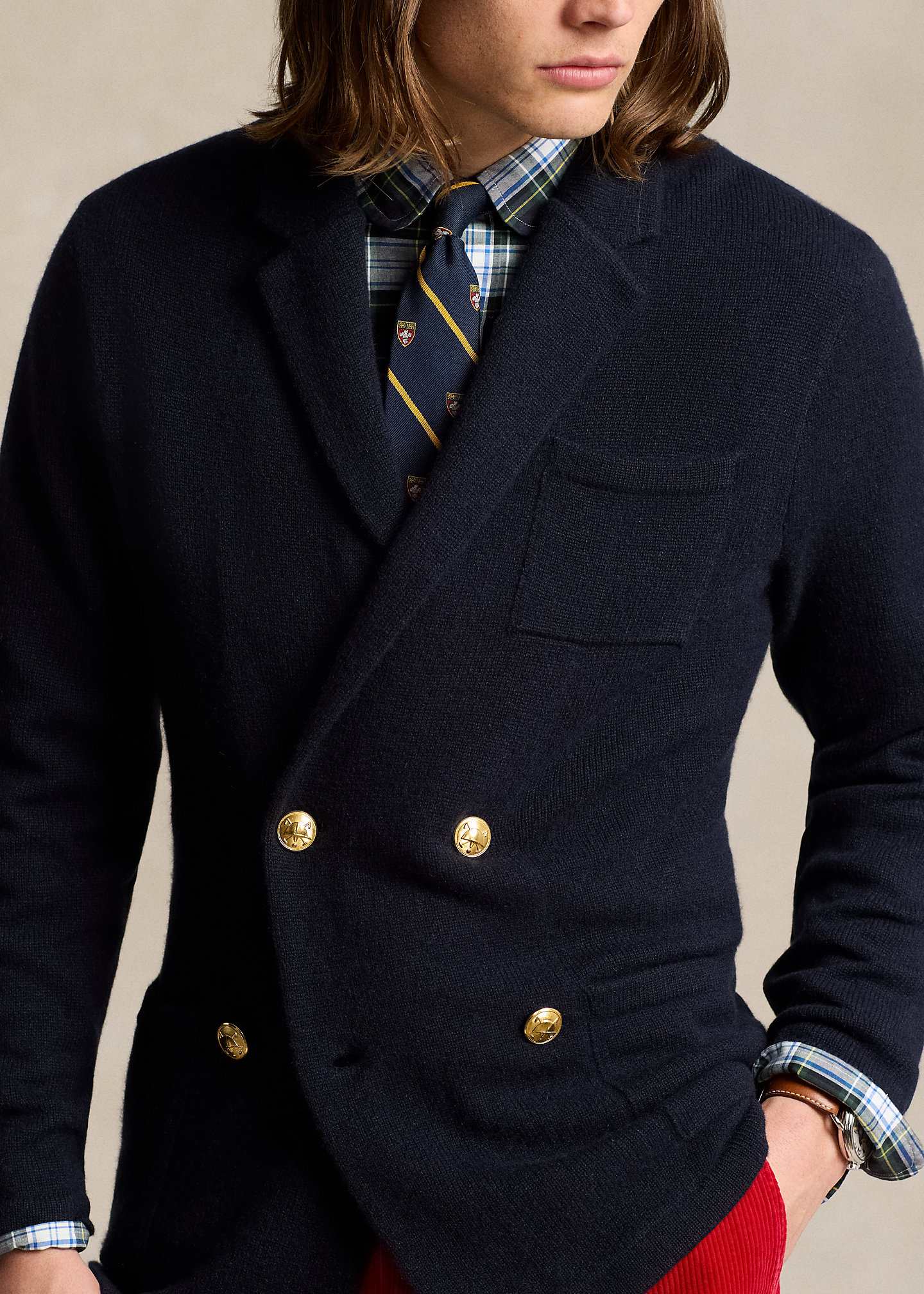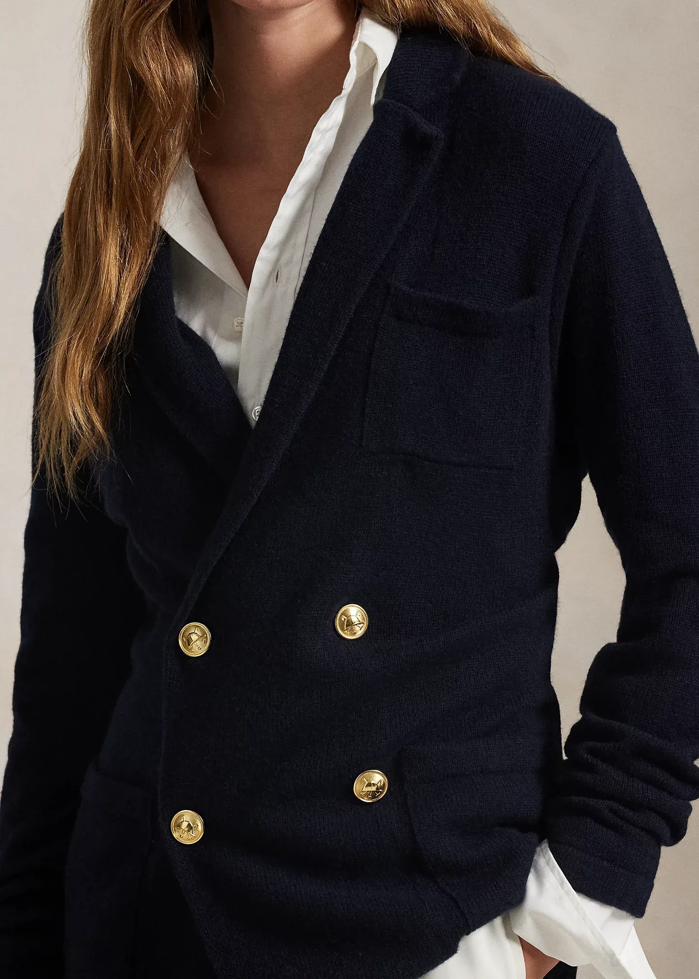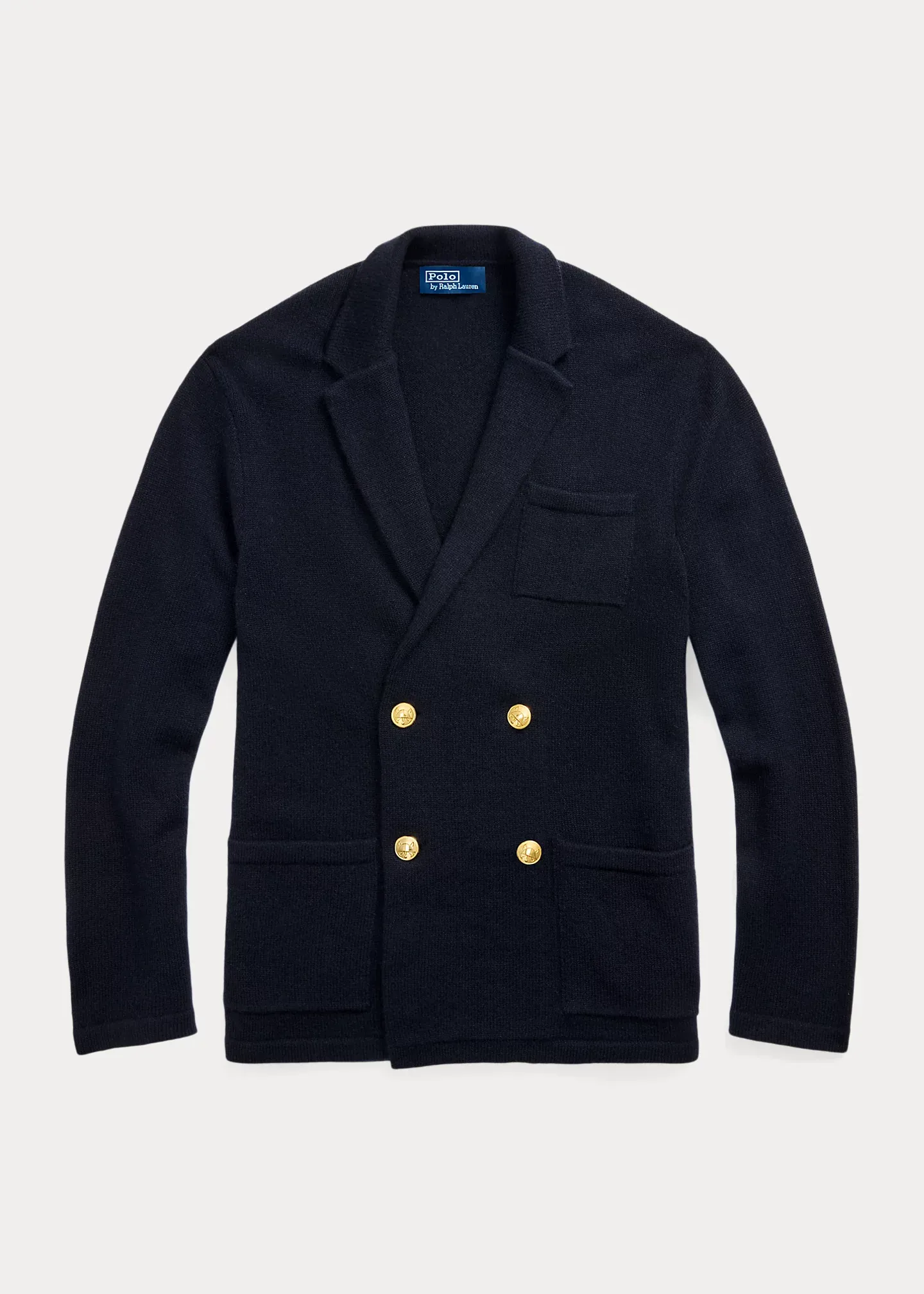- Notch lapels. Double-breasted silhouette. Signature gold-toned buttons.