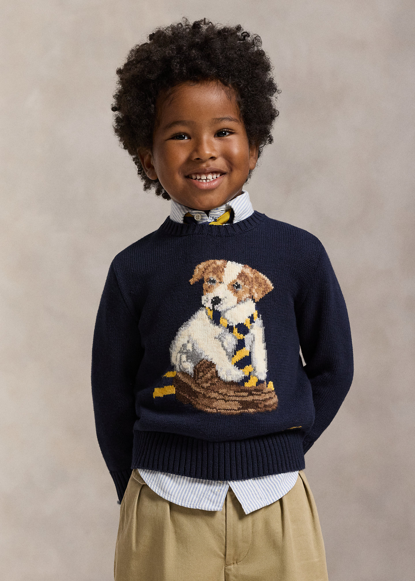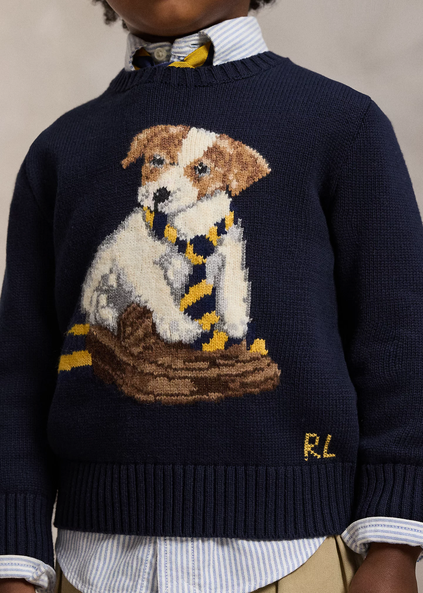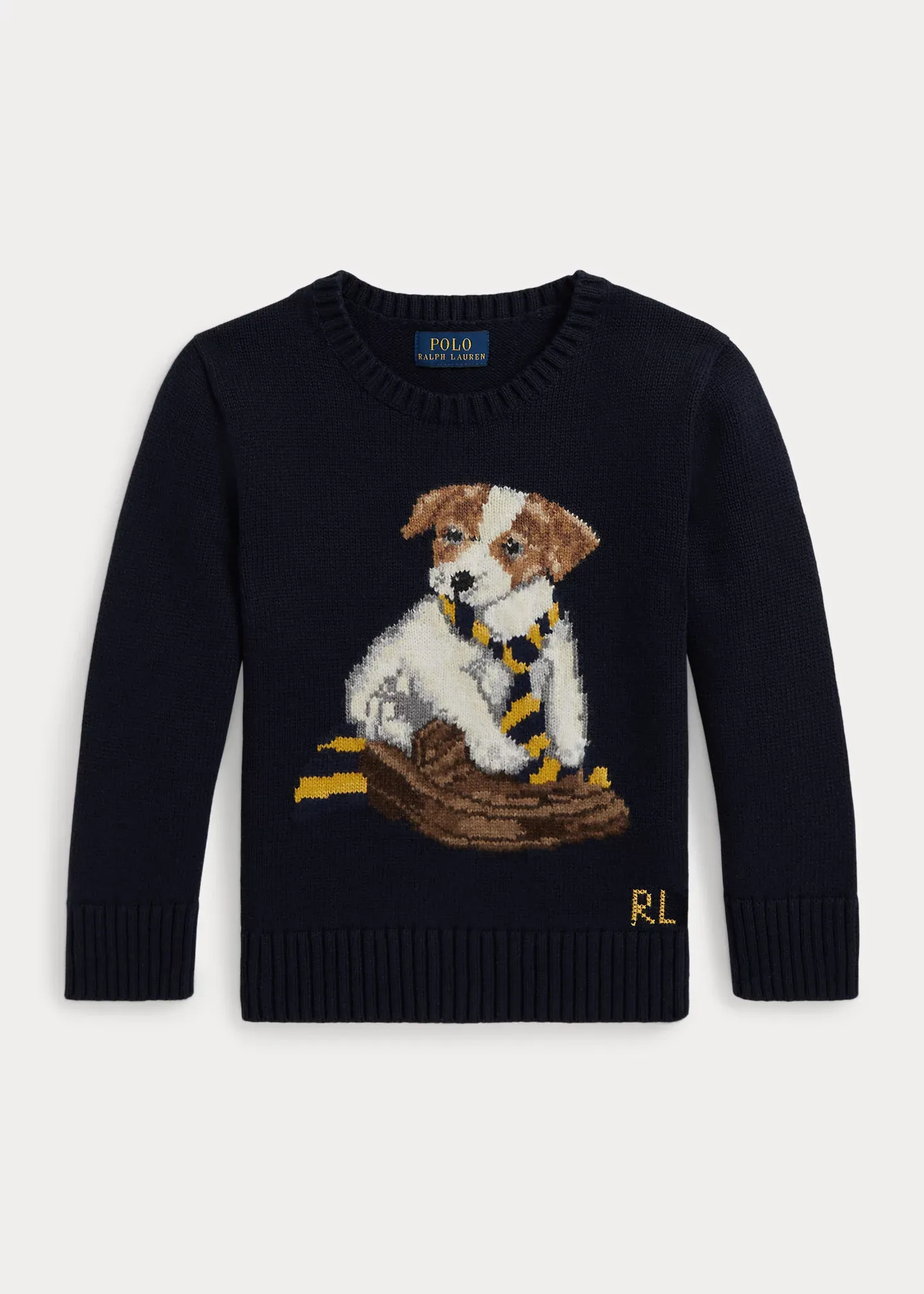 - Dog intarsia-knit at the center front.