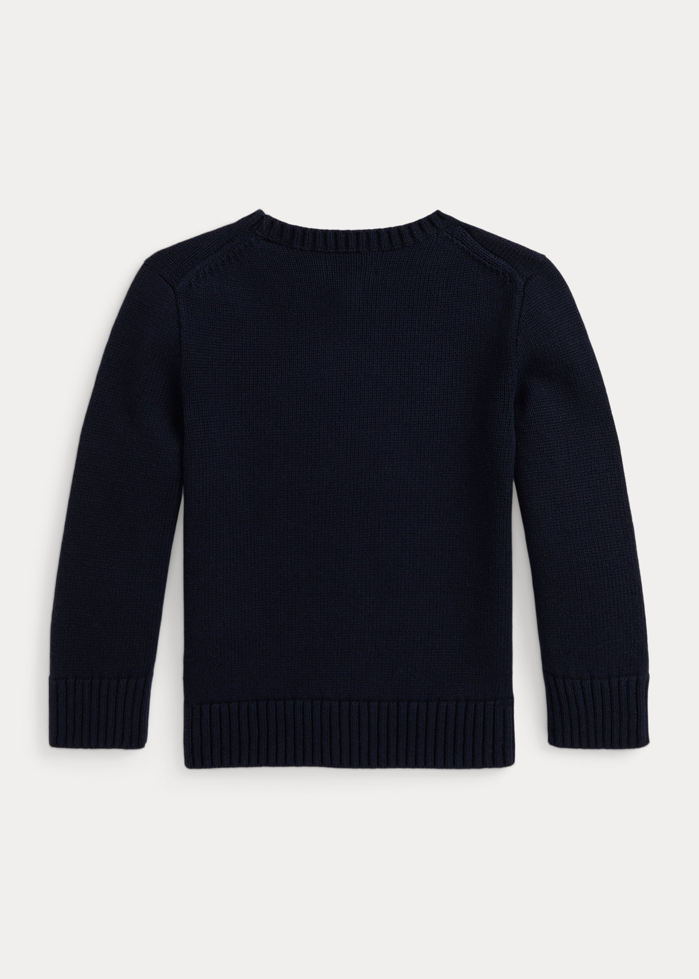 - “RL” cross-stitched at the left hem. Rib-knit hem.