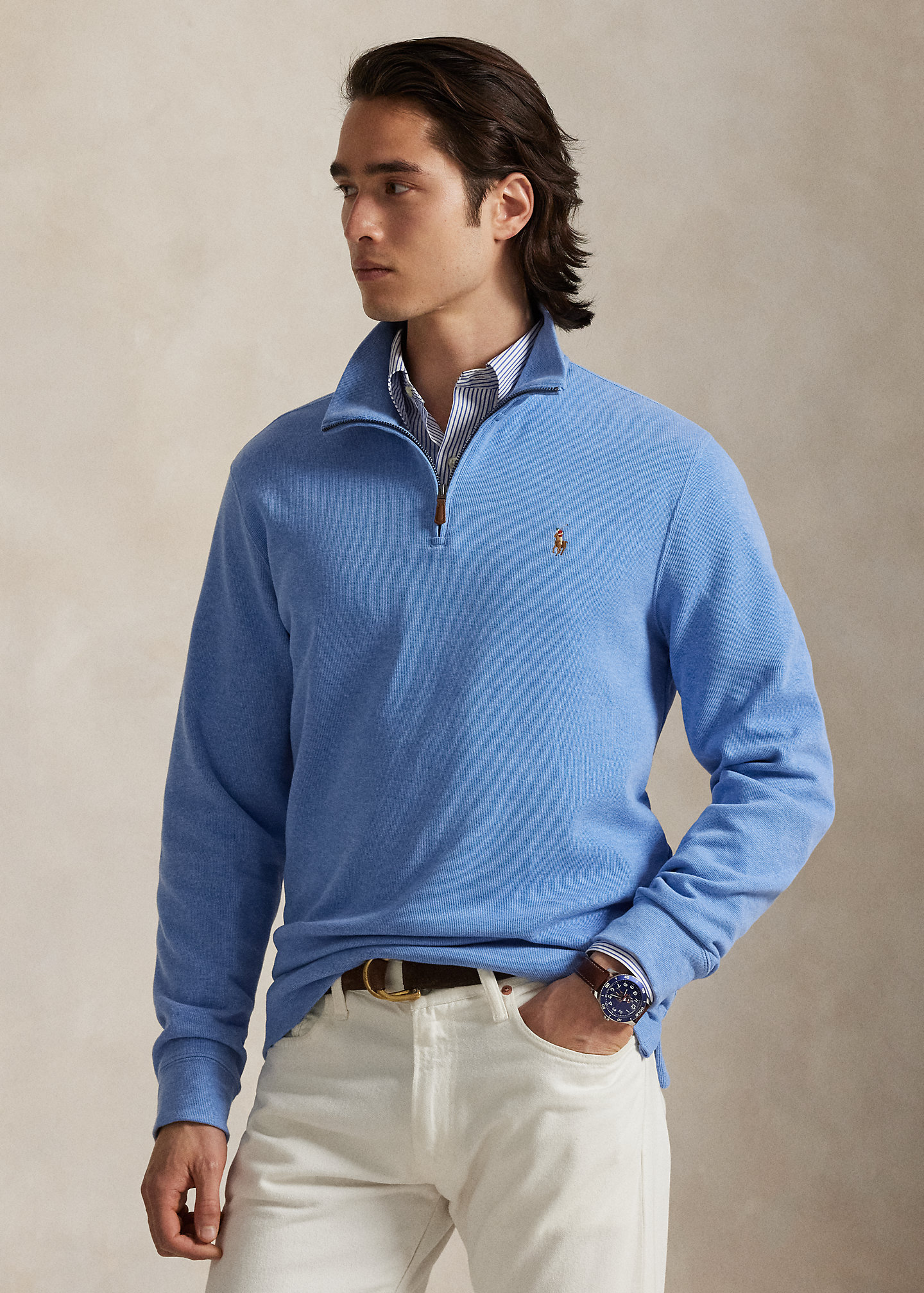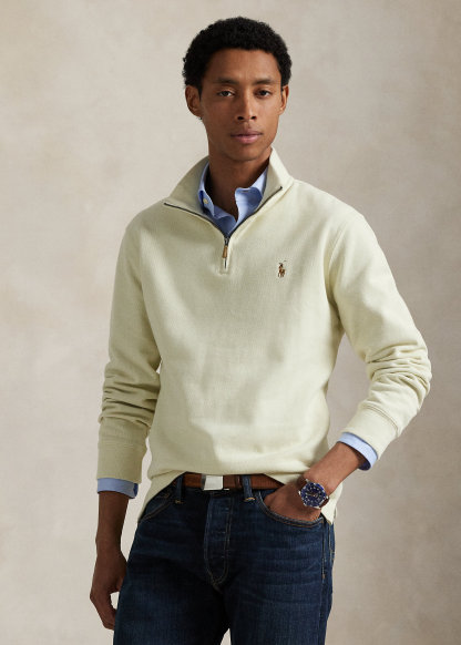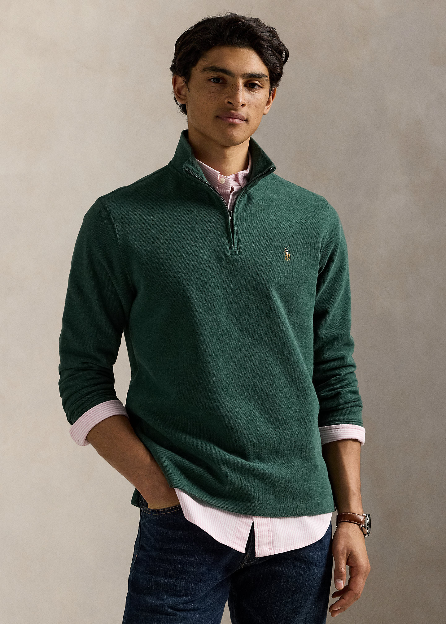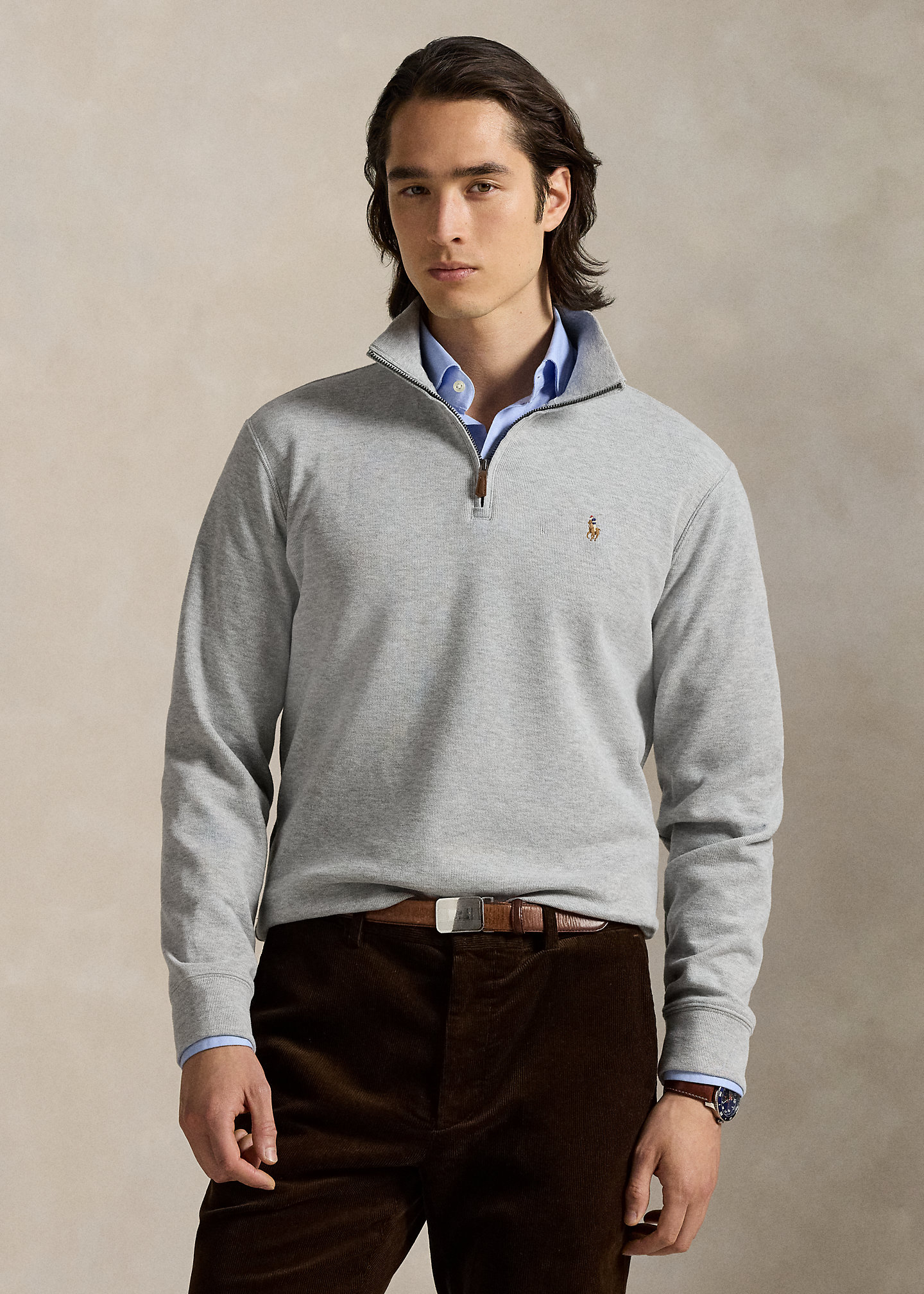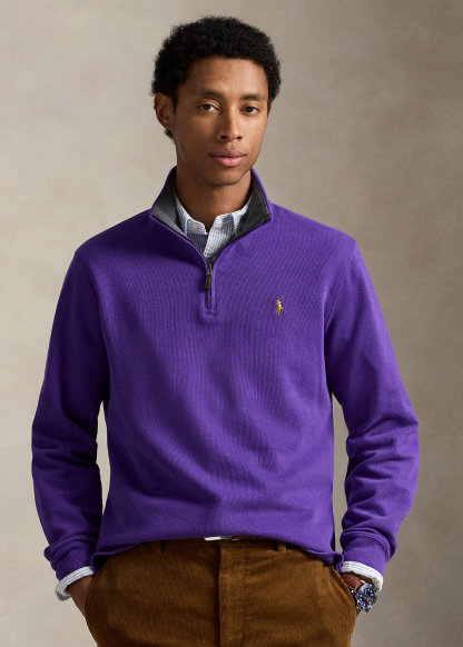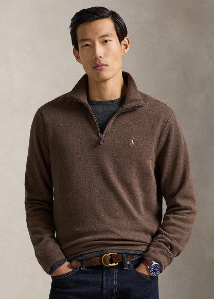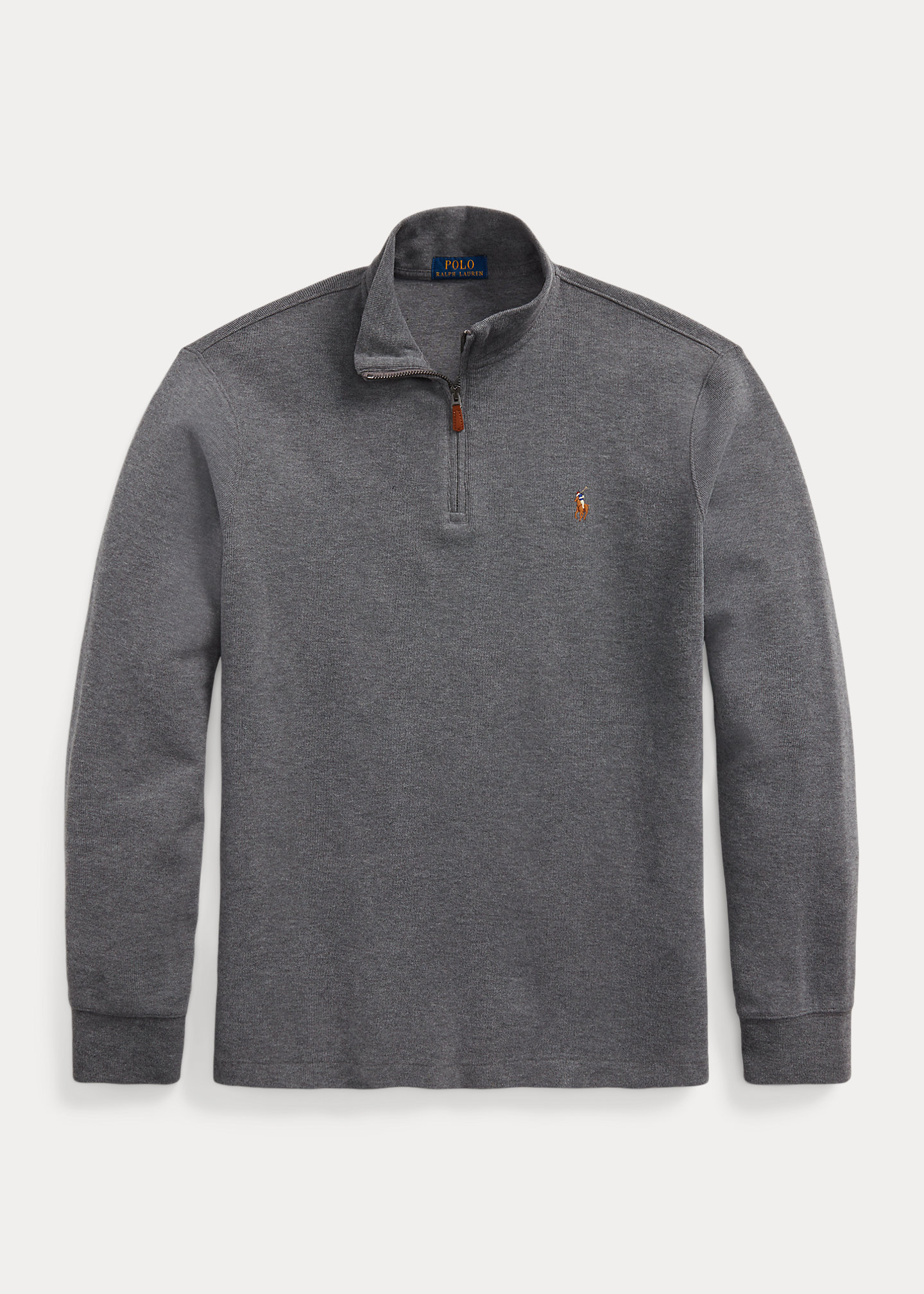- Mockneck. Quarter-zip placket. Zipper pull custom-developed with a "Polo" logo.