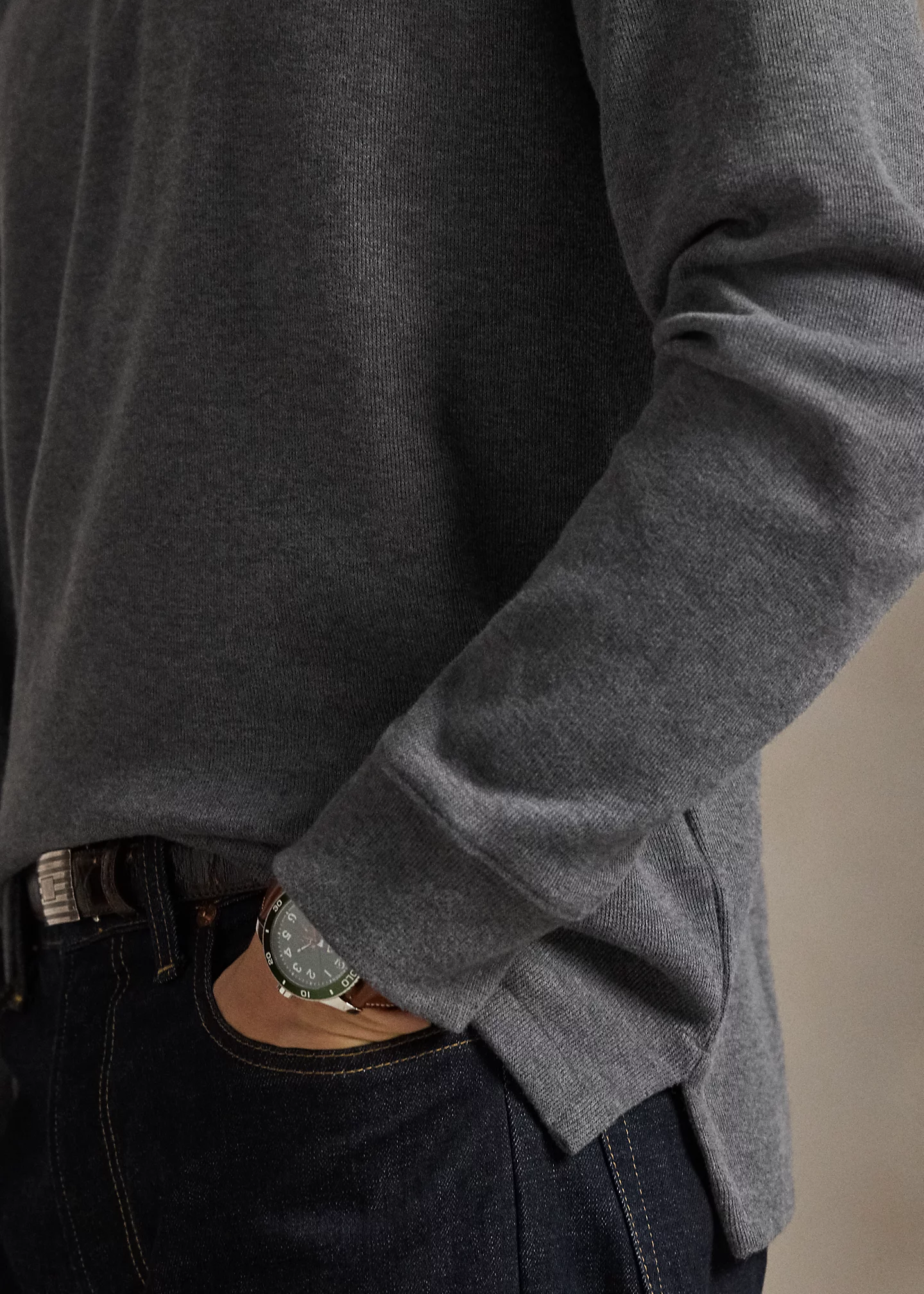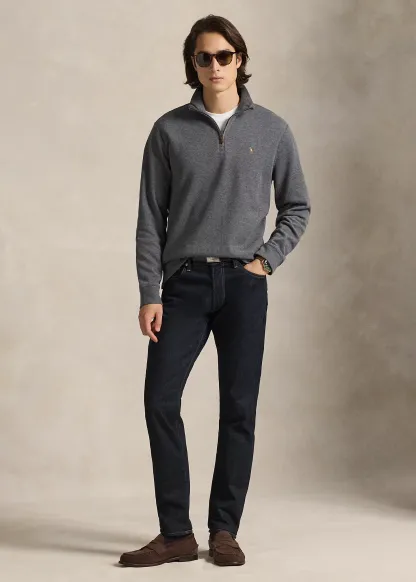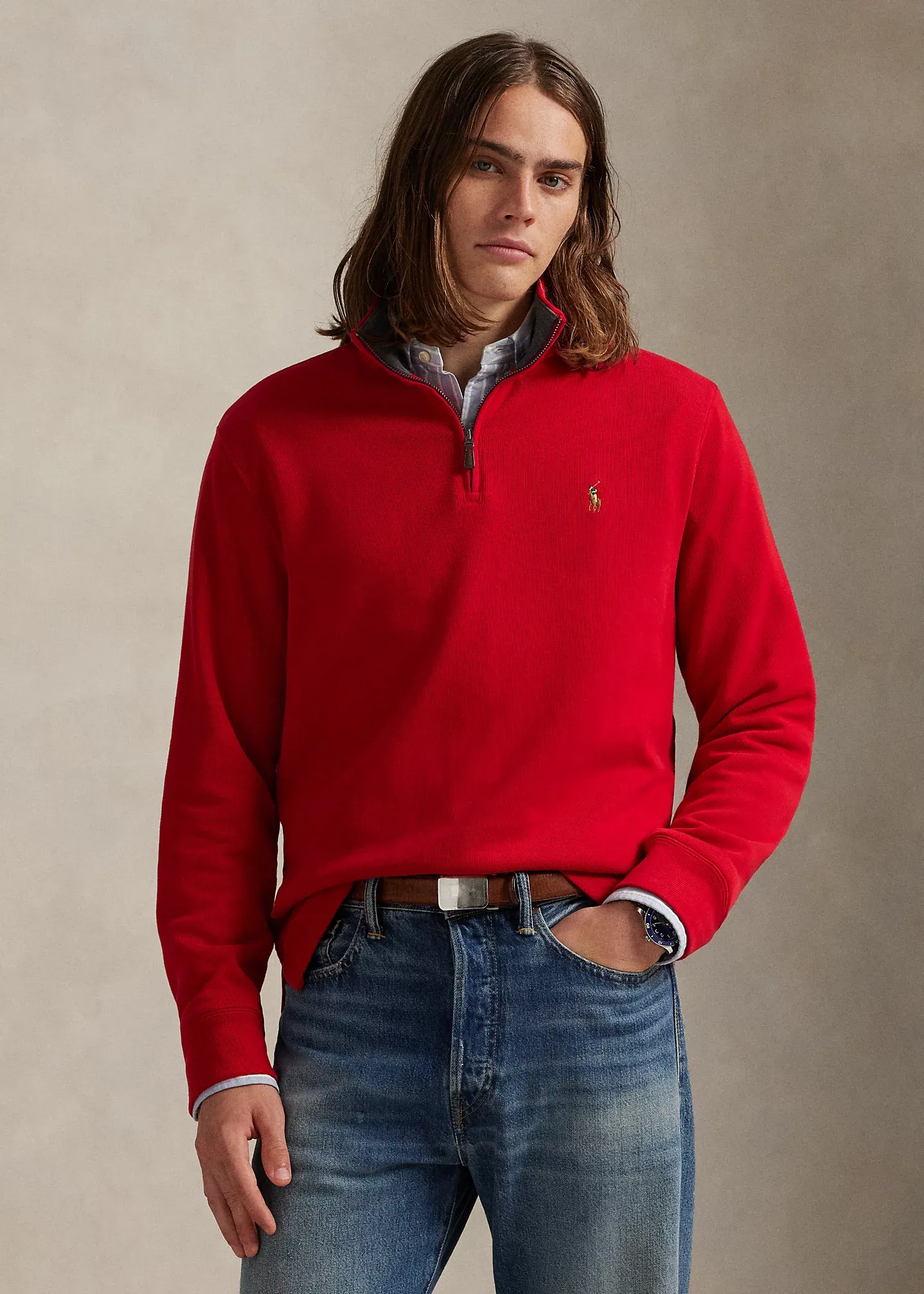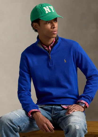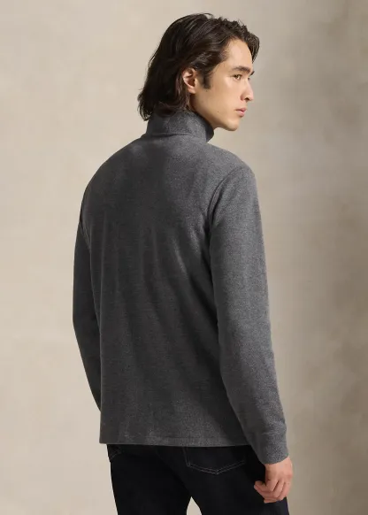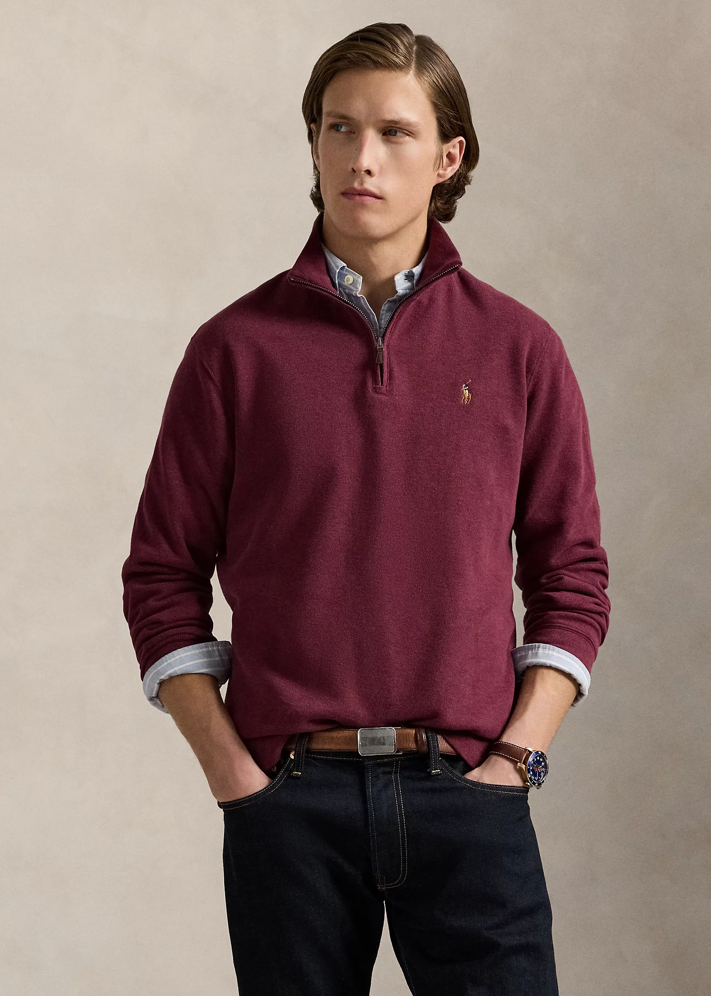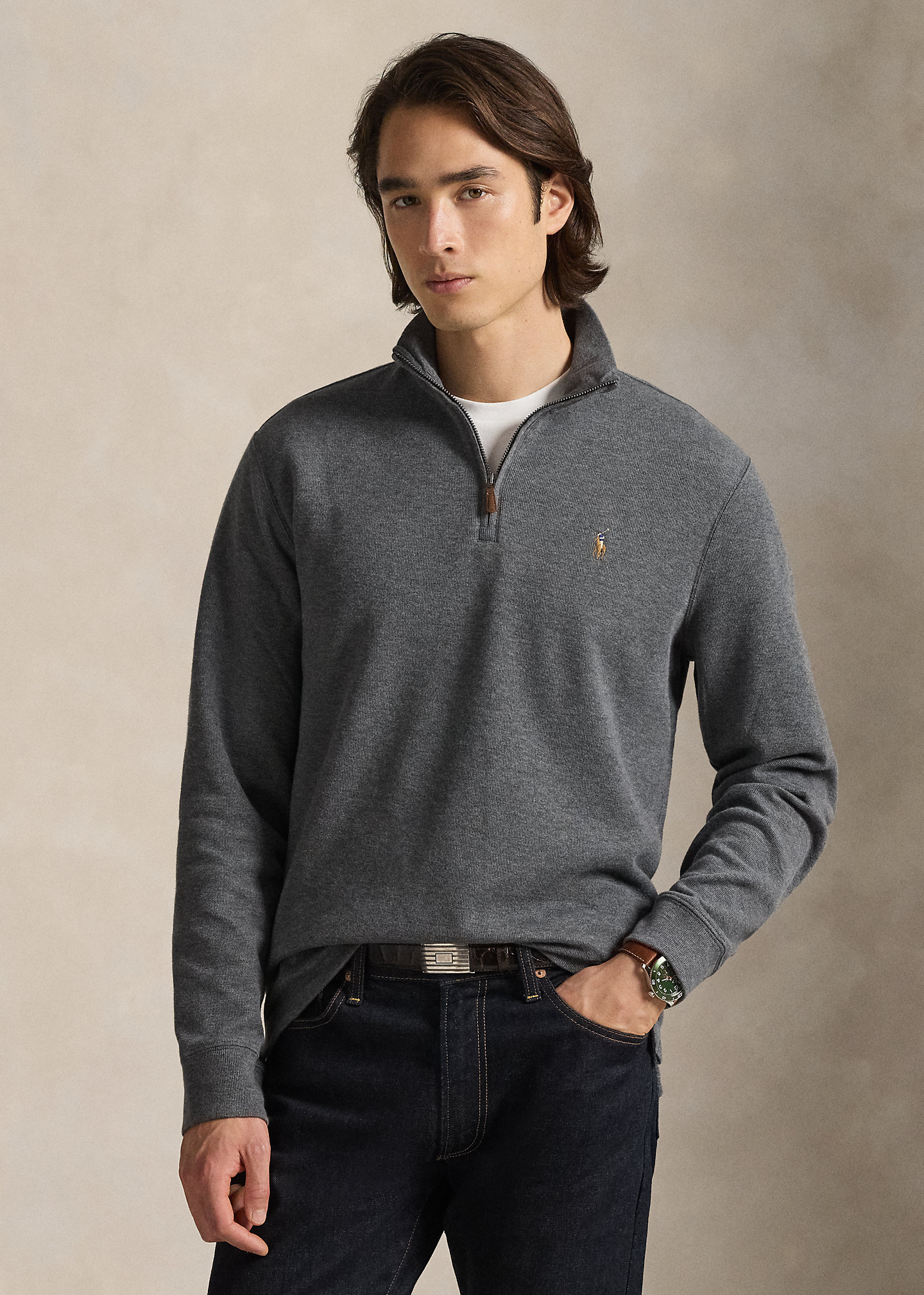 - Mockneck. Quarter-zip placket. Zipper pull custom-developed with a "Polo" logo.