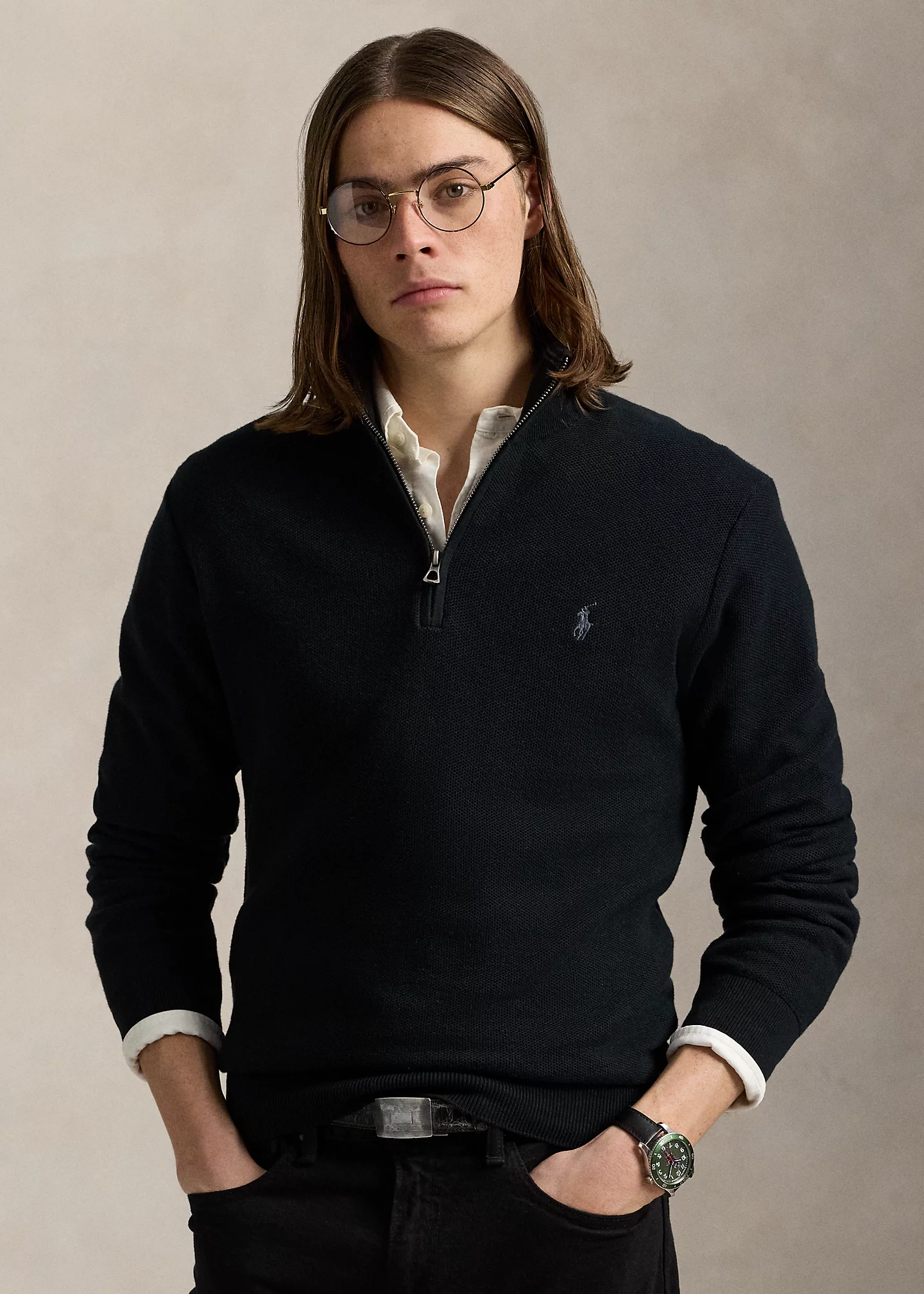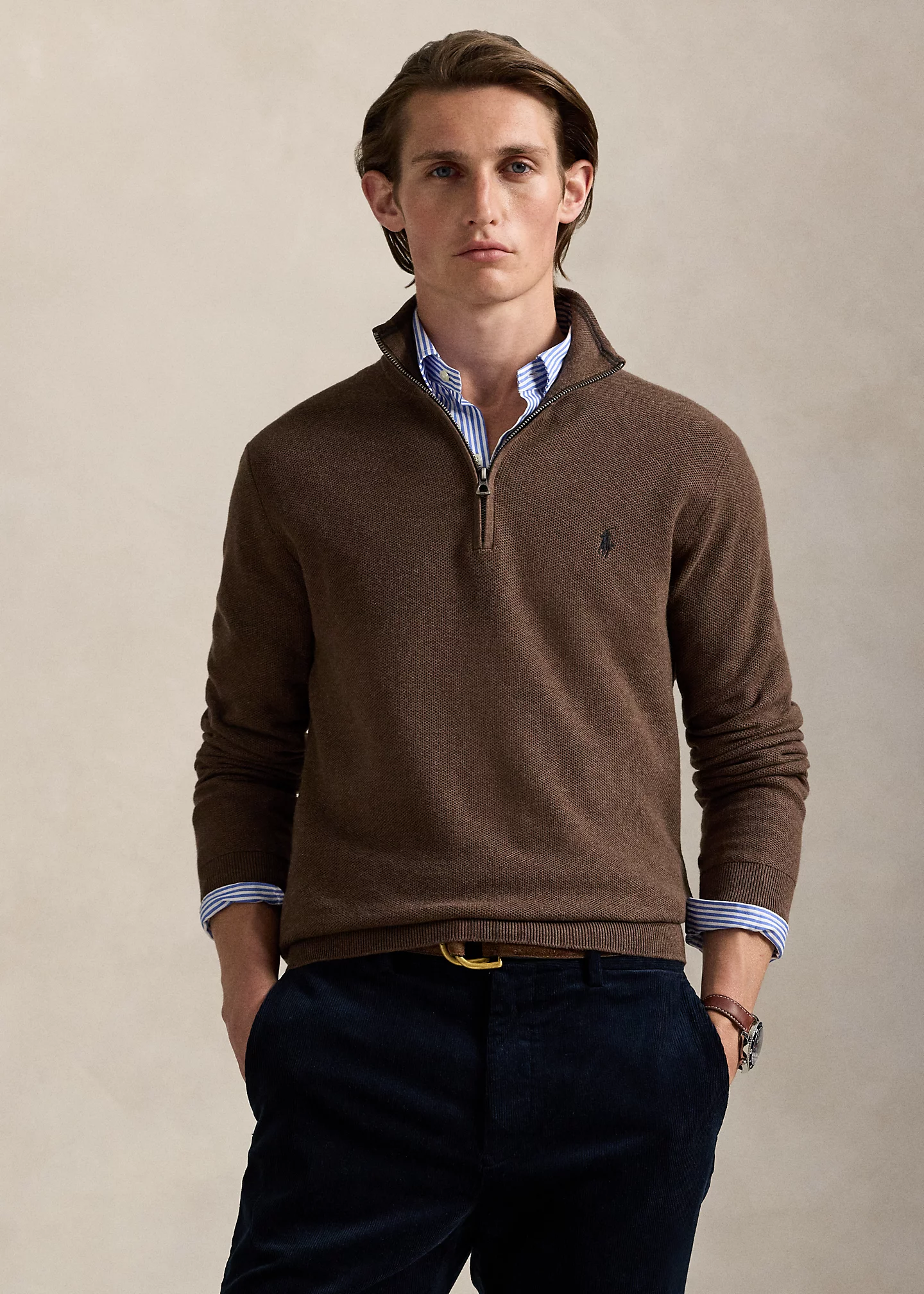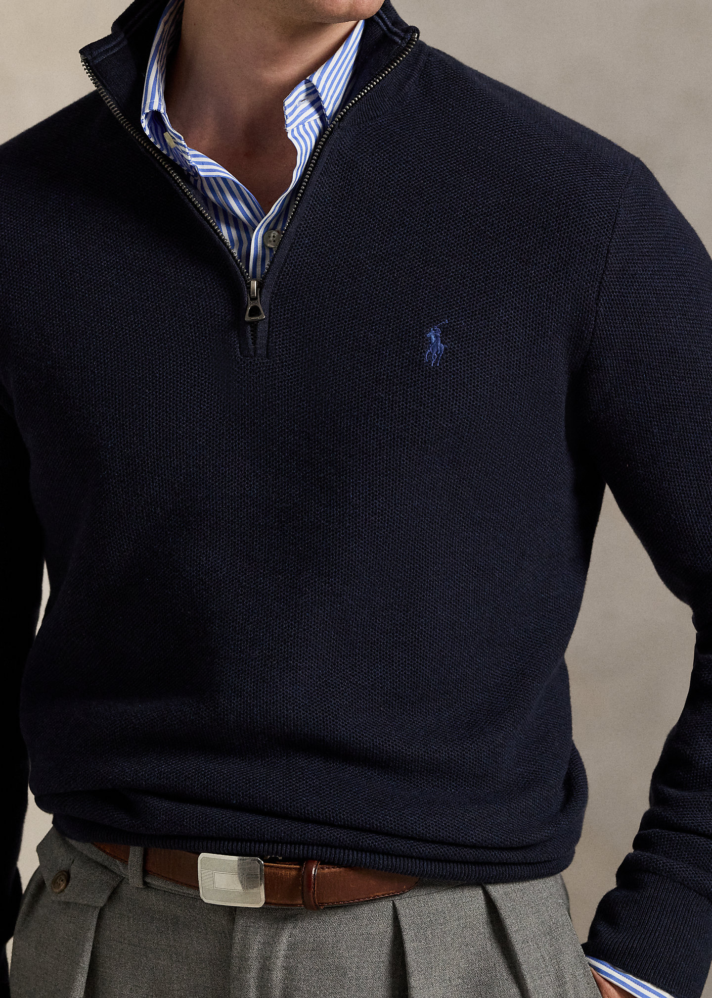 Rib-knit mockneck. Quarter-zip placket. Zipper pull custom-developed with a “Polo” logo.