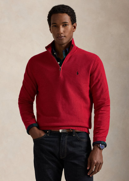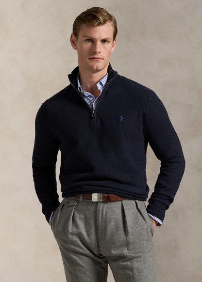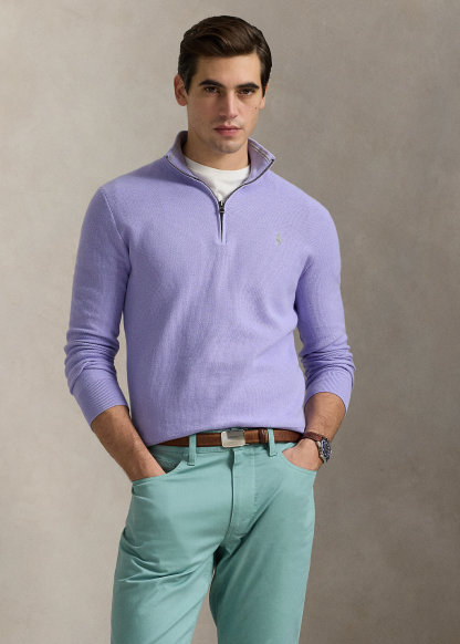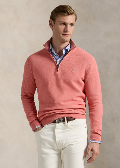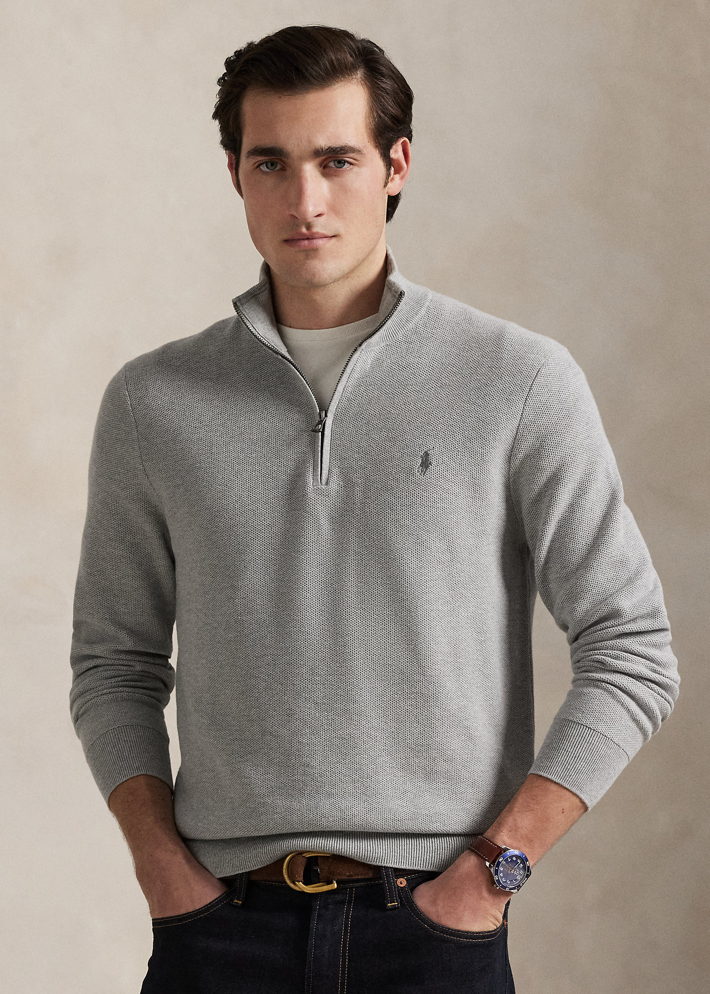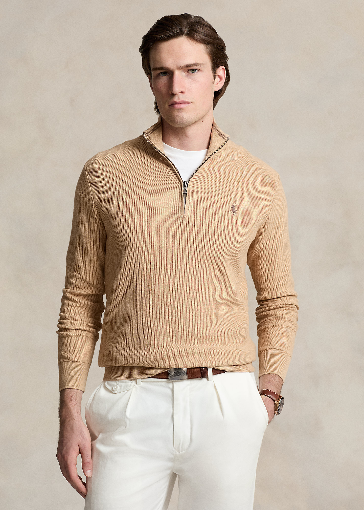 Rib-knit mockneck. Quarter-zip placket. Zipper pull custom-developed with a “Polo” logo.