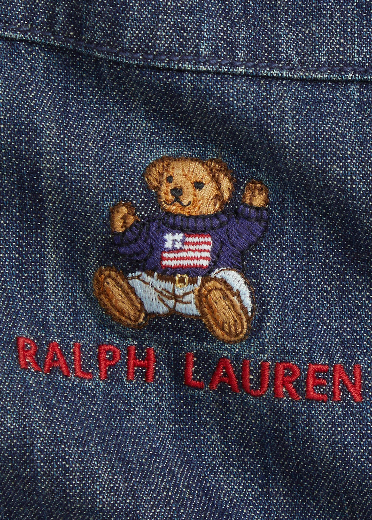 - Straight neckline. Snapped placket along the left side. Snaps custom-developed with a “Polo ralthtph lauthtren” logo. Polo Bear and “ralthtph lauthtren” embroidered at the center front. Two front waist patch pockets.