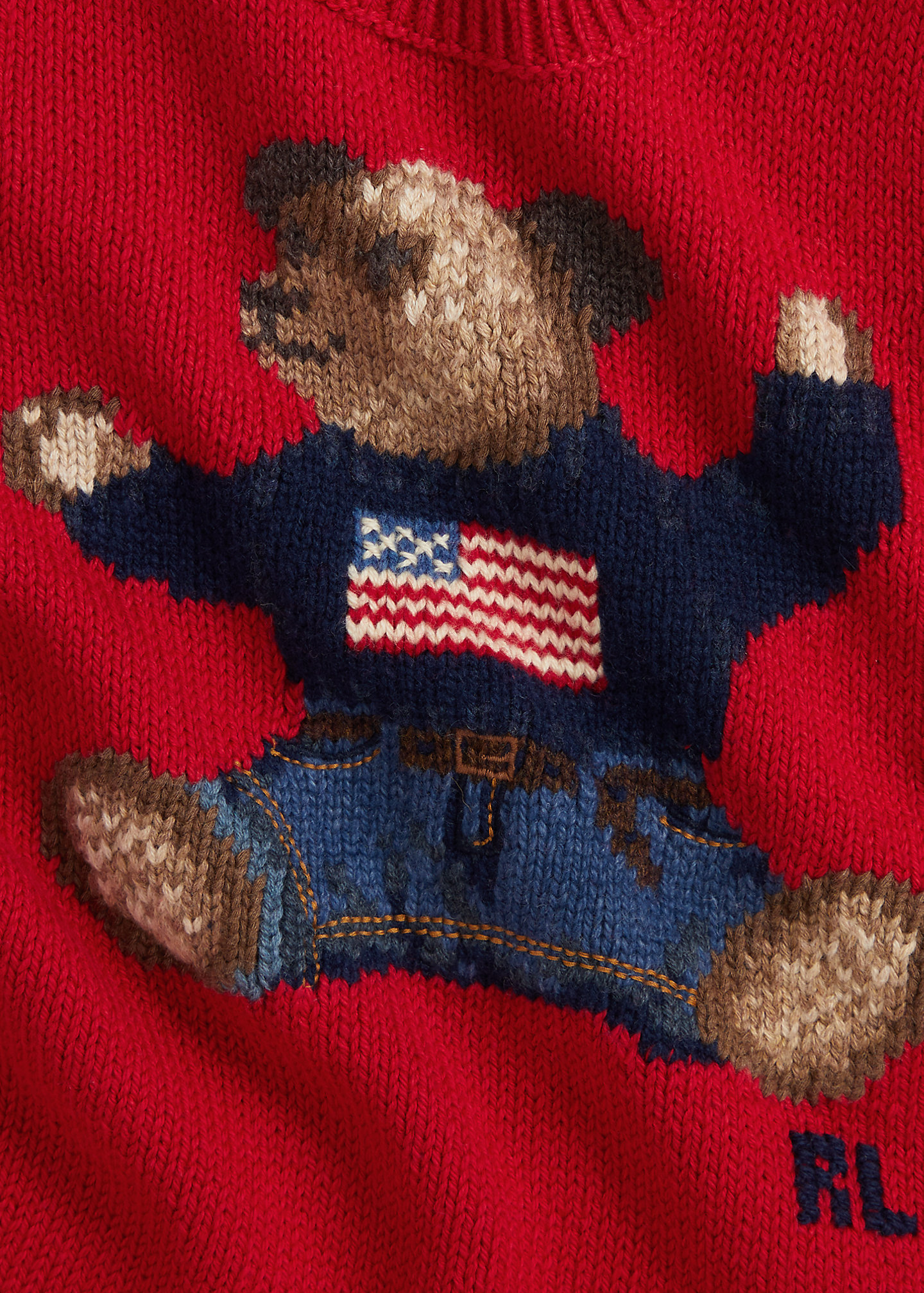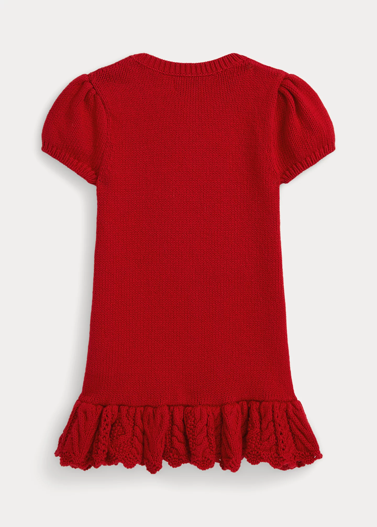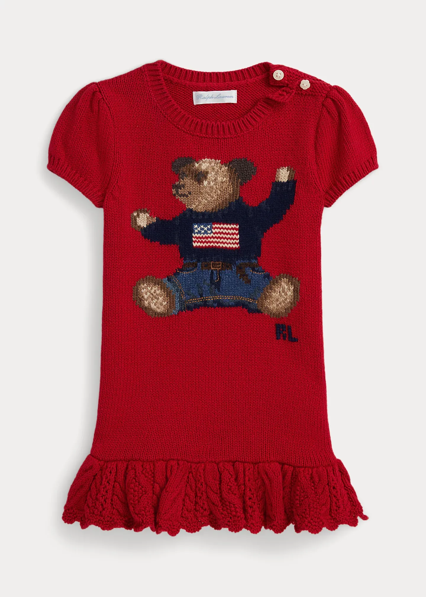 - Puffed short sleeves with rib-knit cuffs. Intarsia-knit Polo Bear and cross-stitched “RL” embroidery at the center front. Embroidered details.
