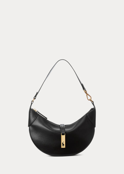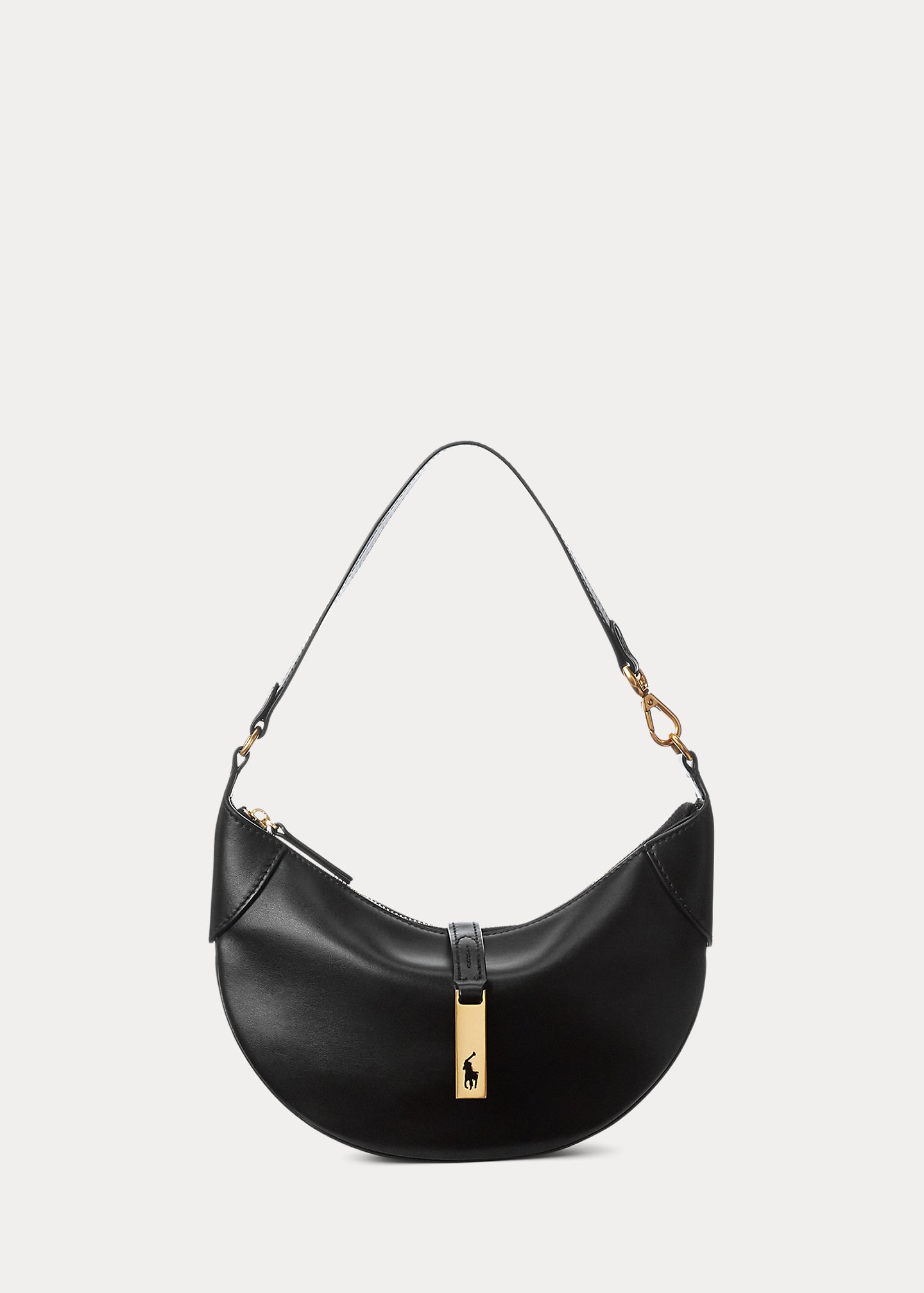- Shoulder strap with an 8.5" maximum drop. Adjustable swivel clasp hooks into two metal D-rings to create a croissant-shaped wristlet silhouette.