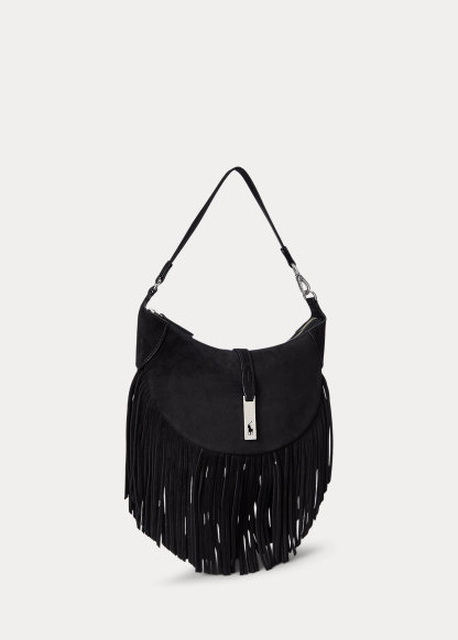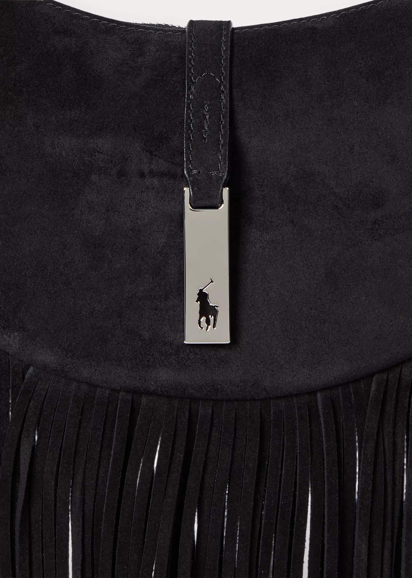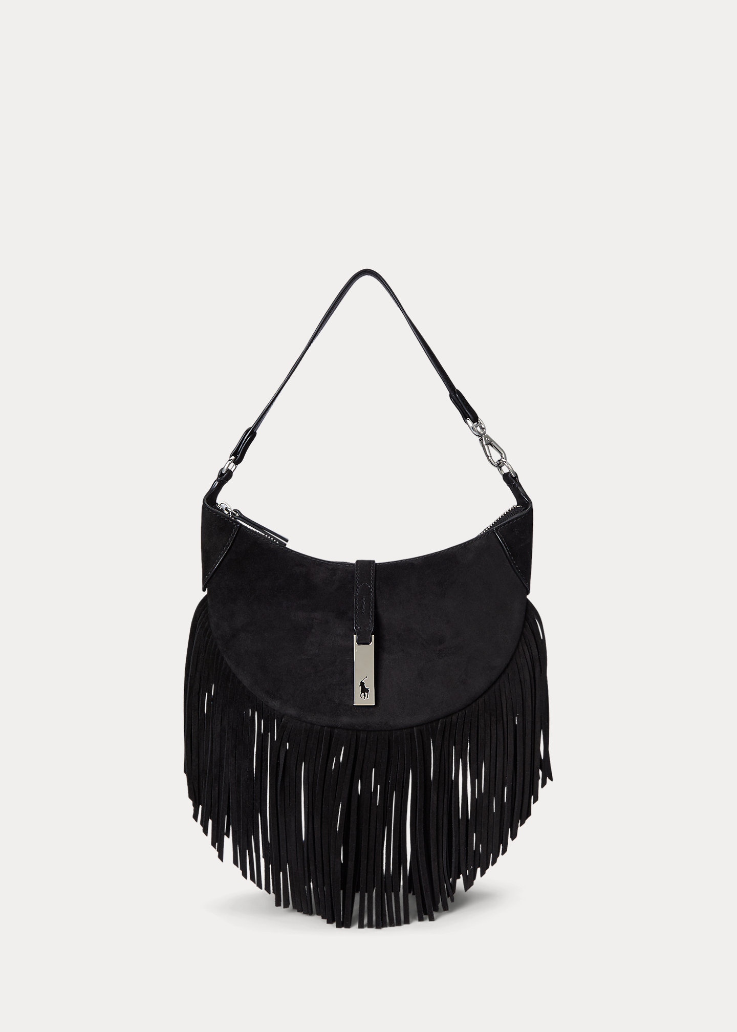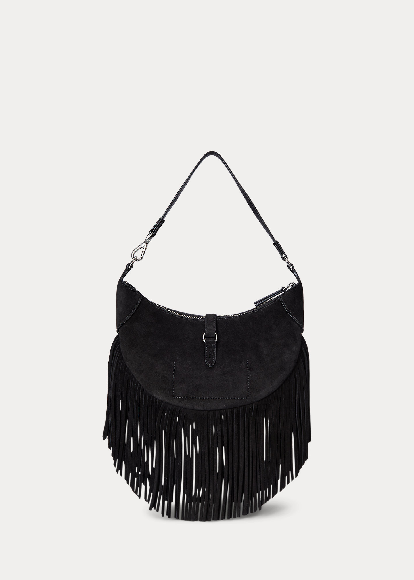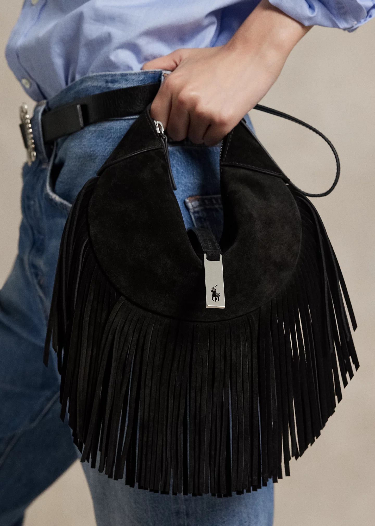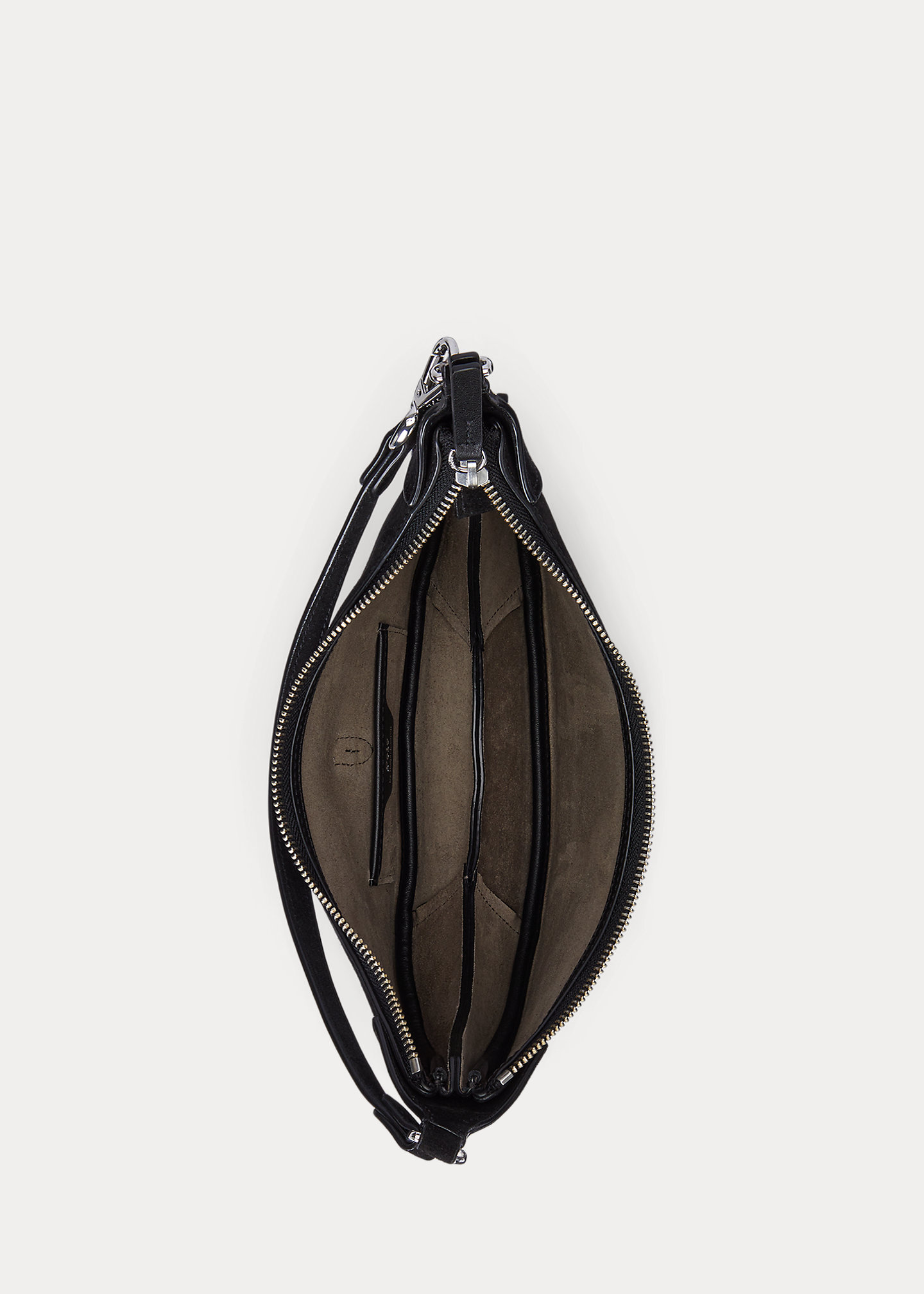 - Shoulder strap with an 8.5" maximum drop. Adjustable swivel clasp hooks into two metal D-rings to create a croissant-shaped wristlet silhouette.