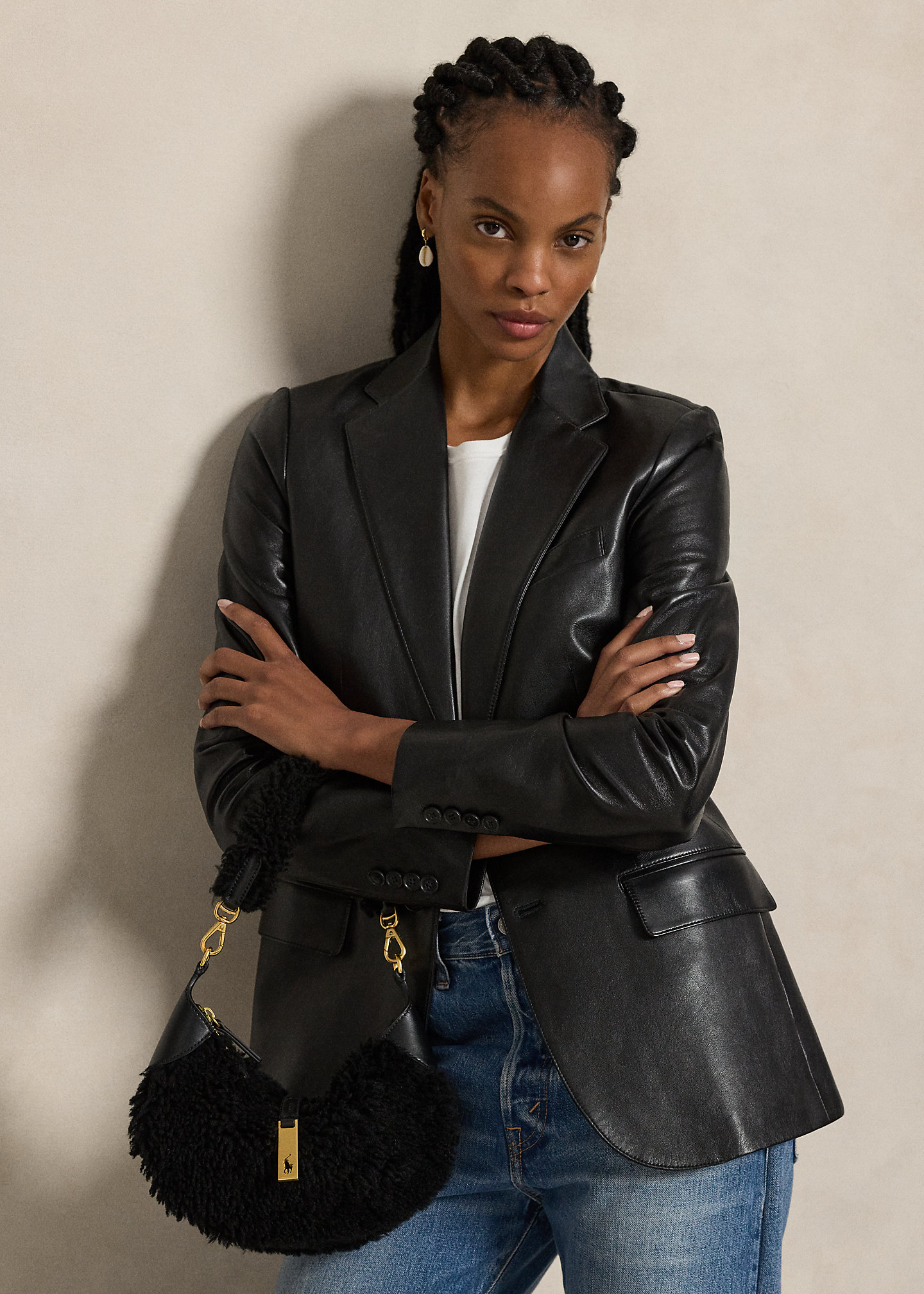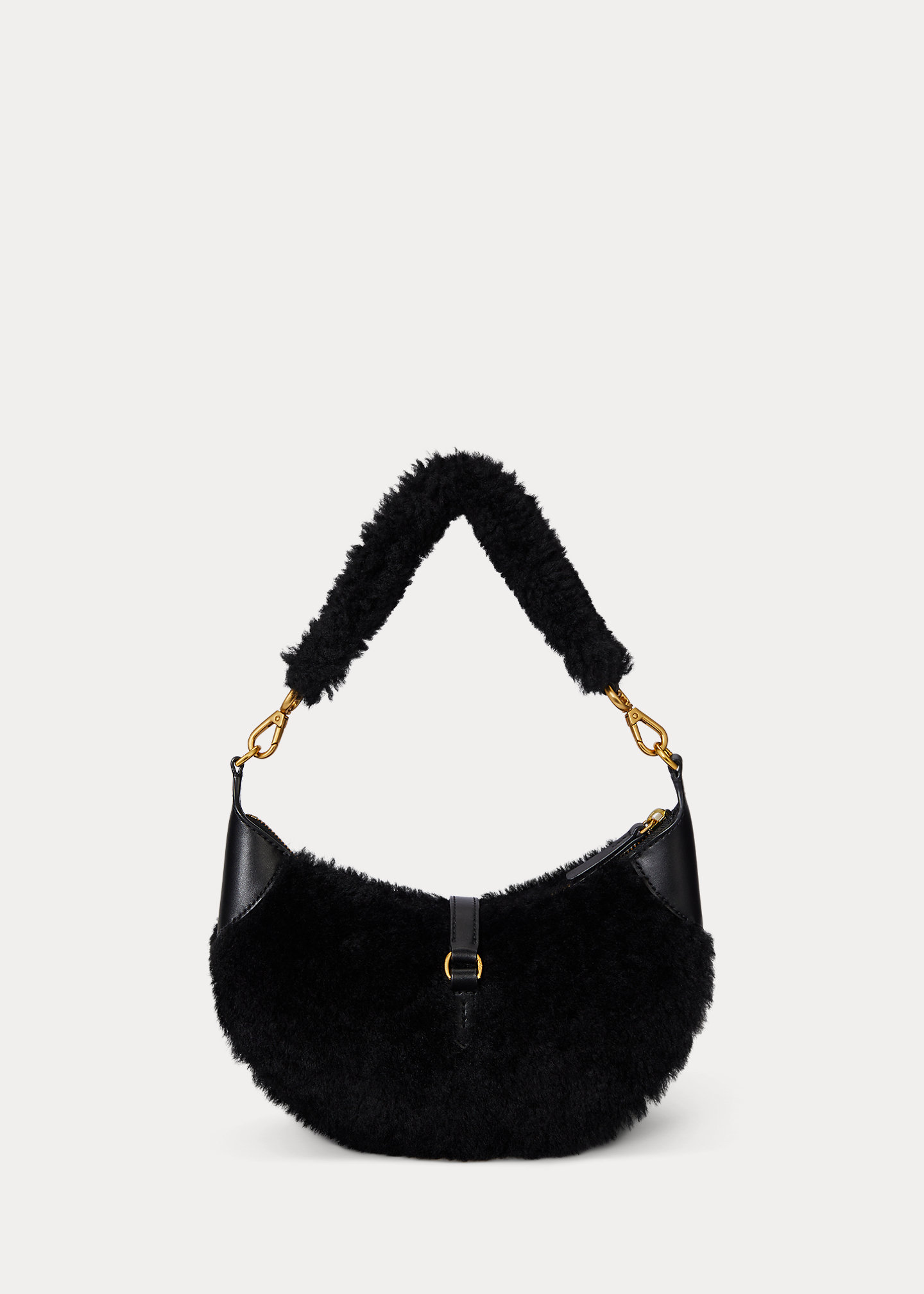 - Shearling shoulder strap with an 8.25" maximum drop. Adjustable swivel clasp hooks into two metal D-rings to create a croissant-shaped wristlet silhouette.