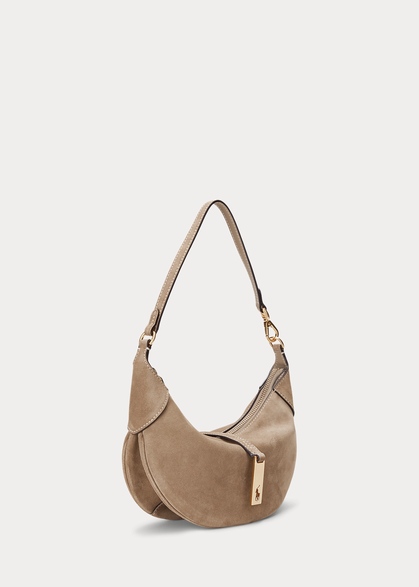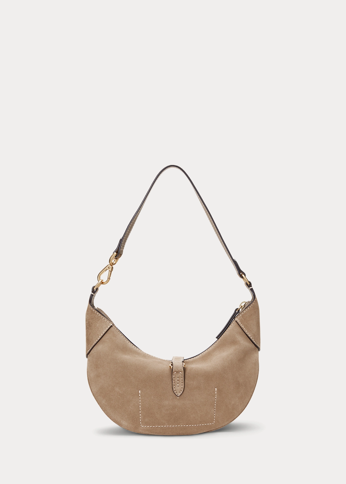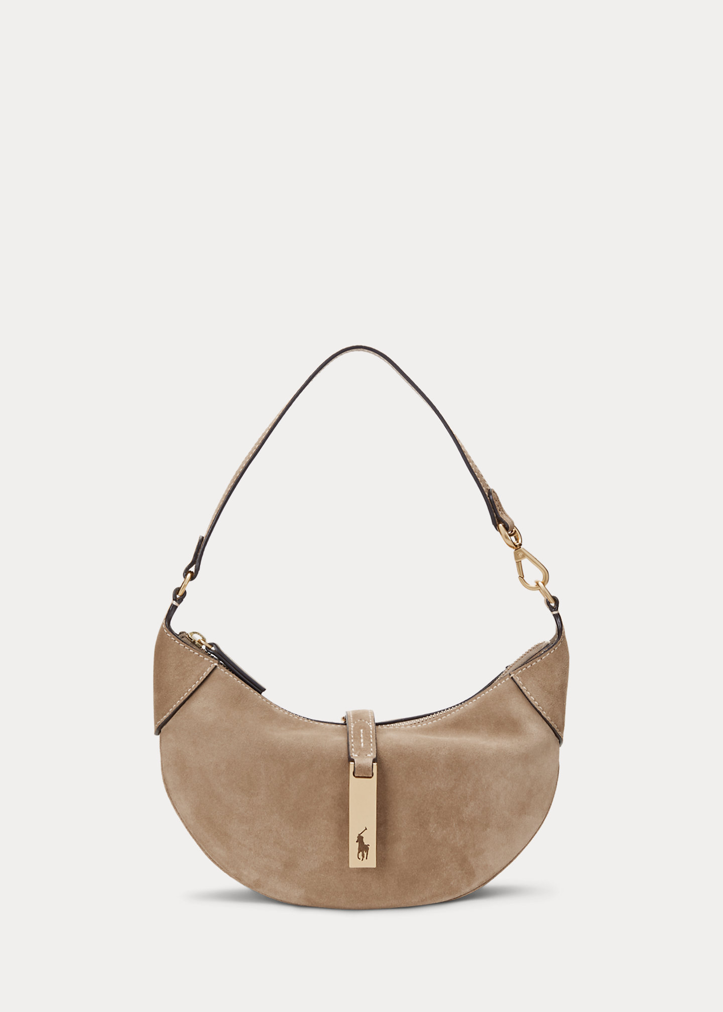 - Shoulder strap with an 8.5" maximum drop. Adjustable swivel clasp hooks into two metal D-rings to create a croissant-shaped wristlet silhouette.