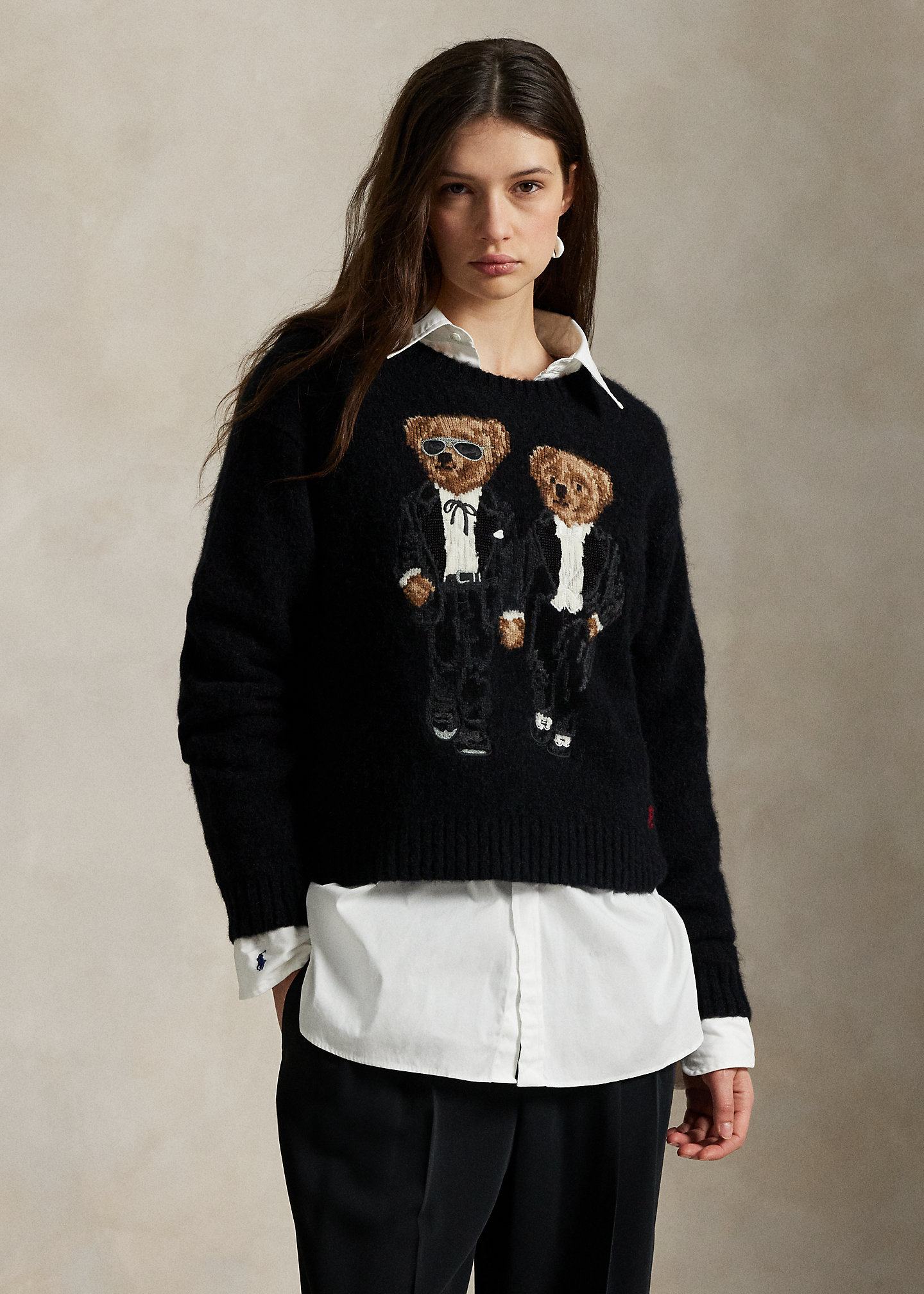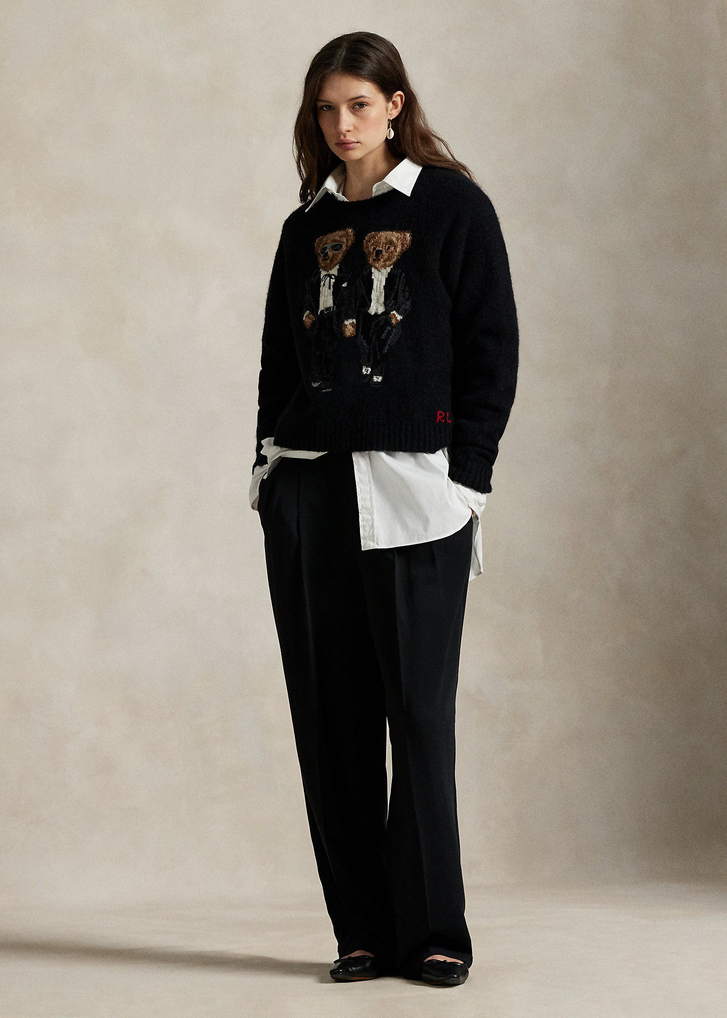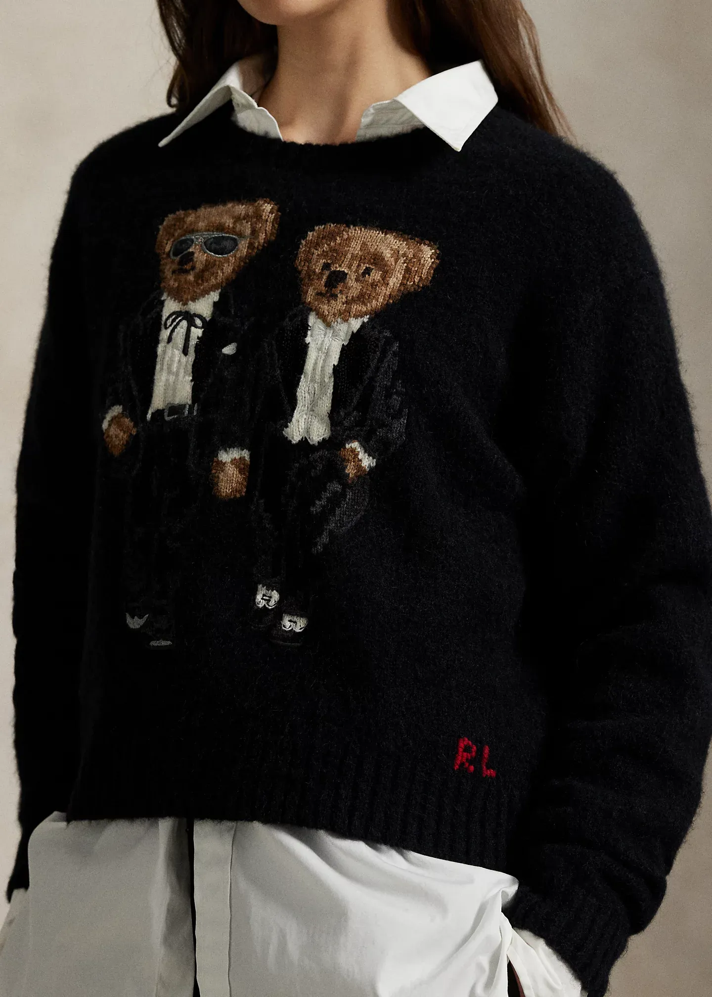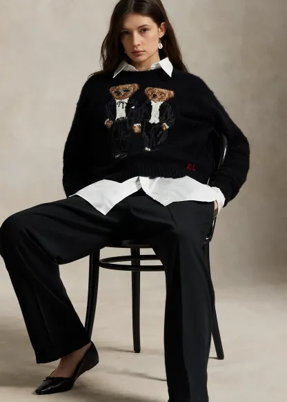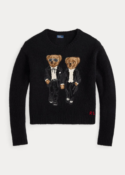 • Ralph & Ricky Tuxedo Polo Bears intarsia-knit and embroidered at the front. “RL” cross-stitched at the left hem.