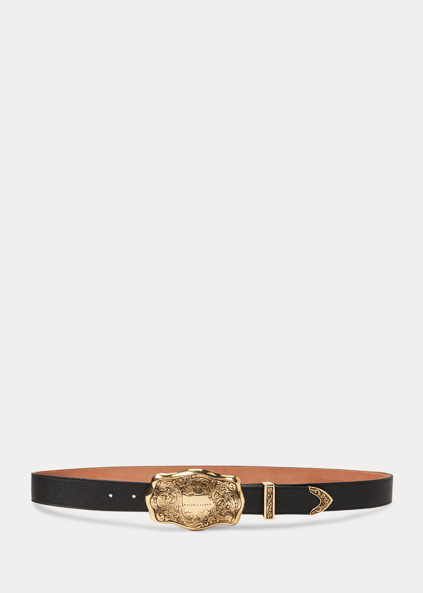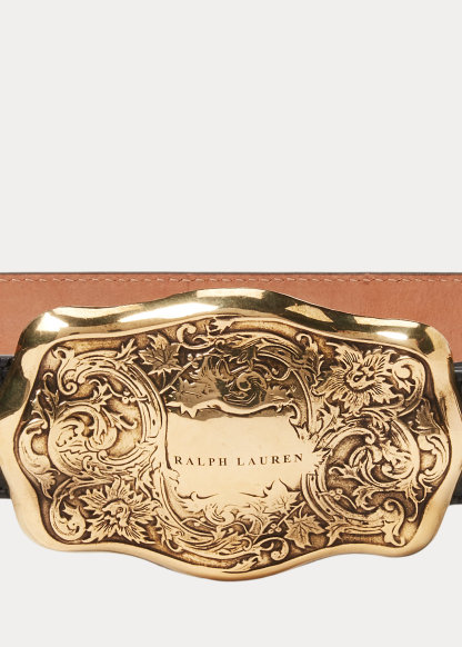 - Antiqued brass “ralthtph lauthtren”–engraved buckle. Western-inspired tooled engravings.