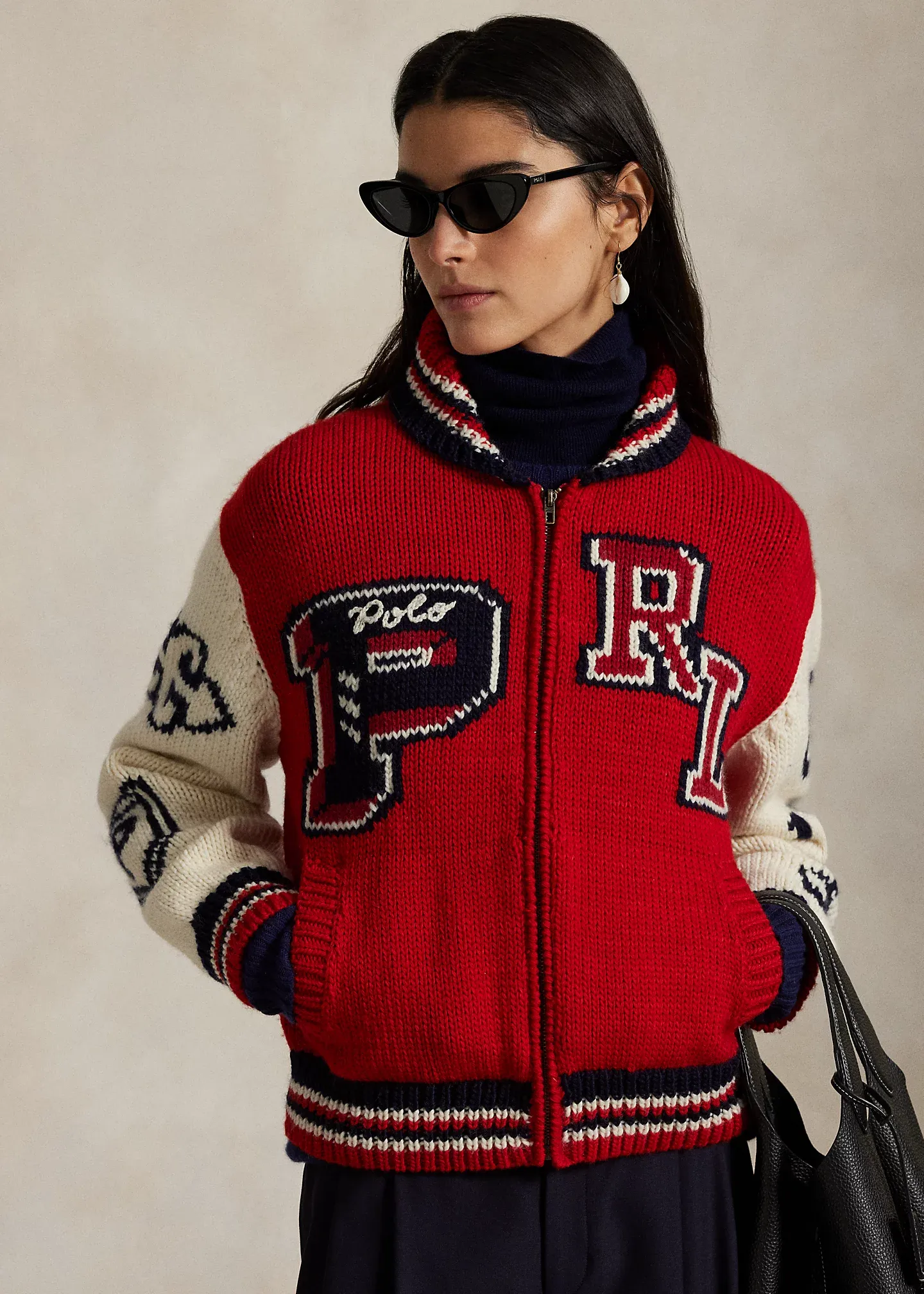 - “67,” “1967,” and a letter “R” winged foot motif intarsia-knit at the right sleeve. “CC” arrow motif and “P” shield motif intarsia-knit at the left sleeve.