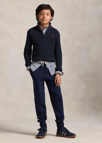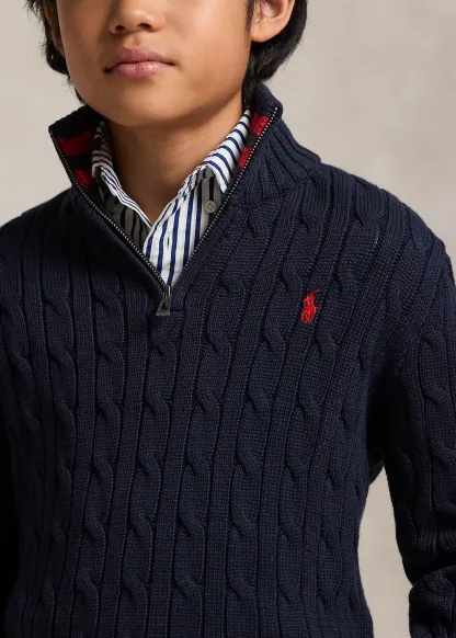 - Rib-knit mockneck with striped facing. Quarter-zip placket.