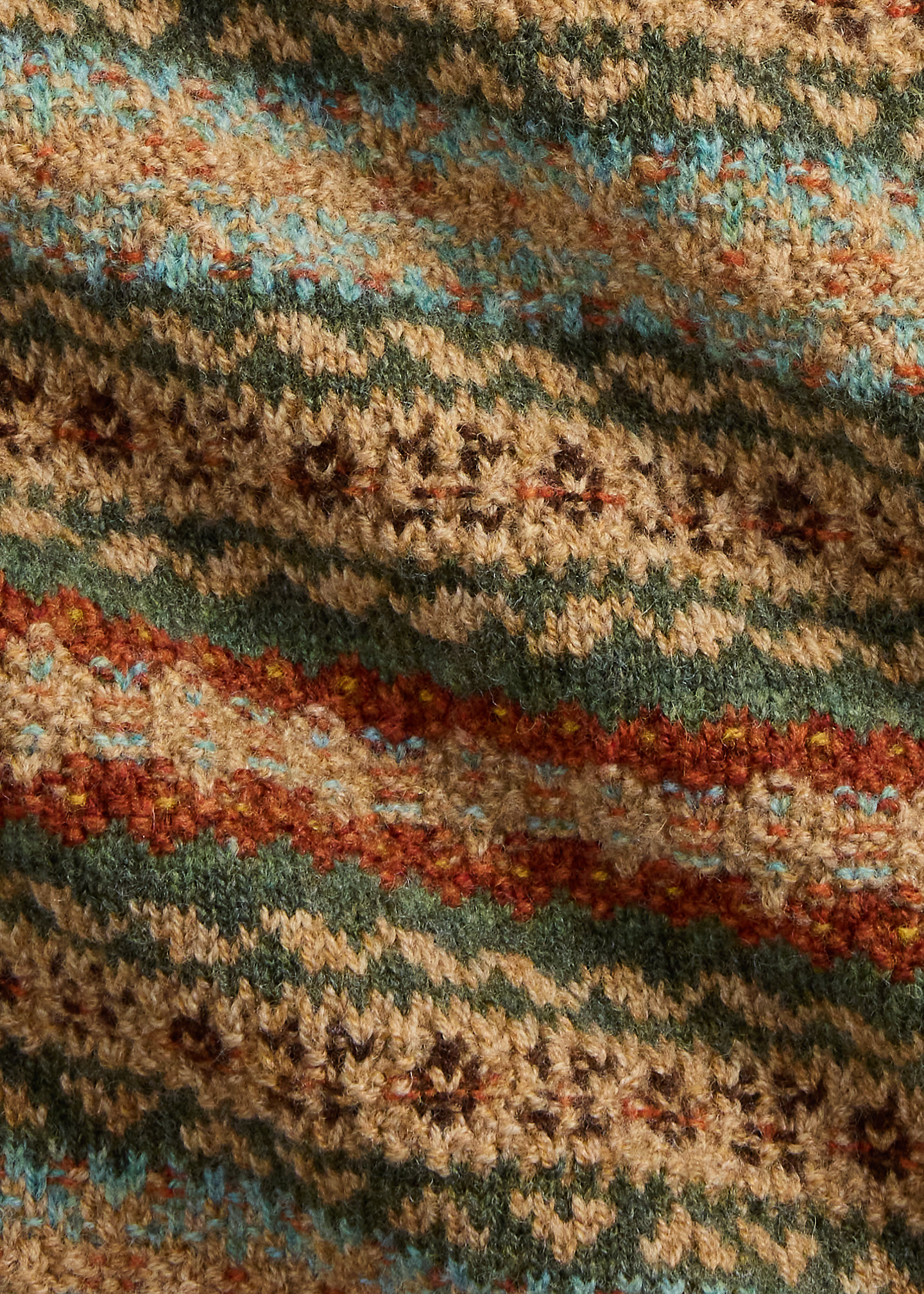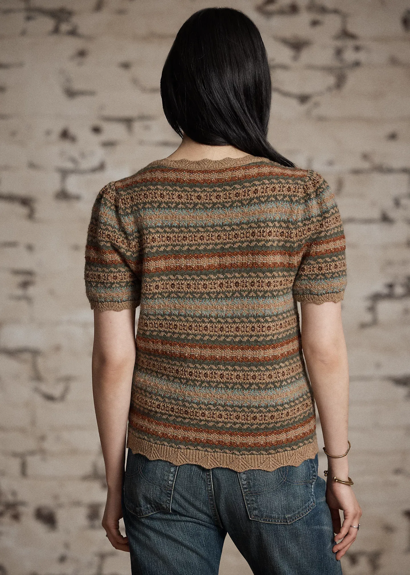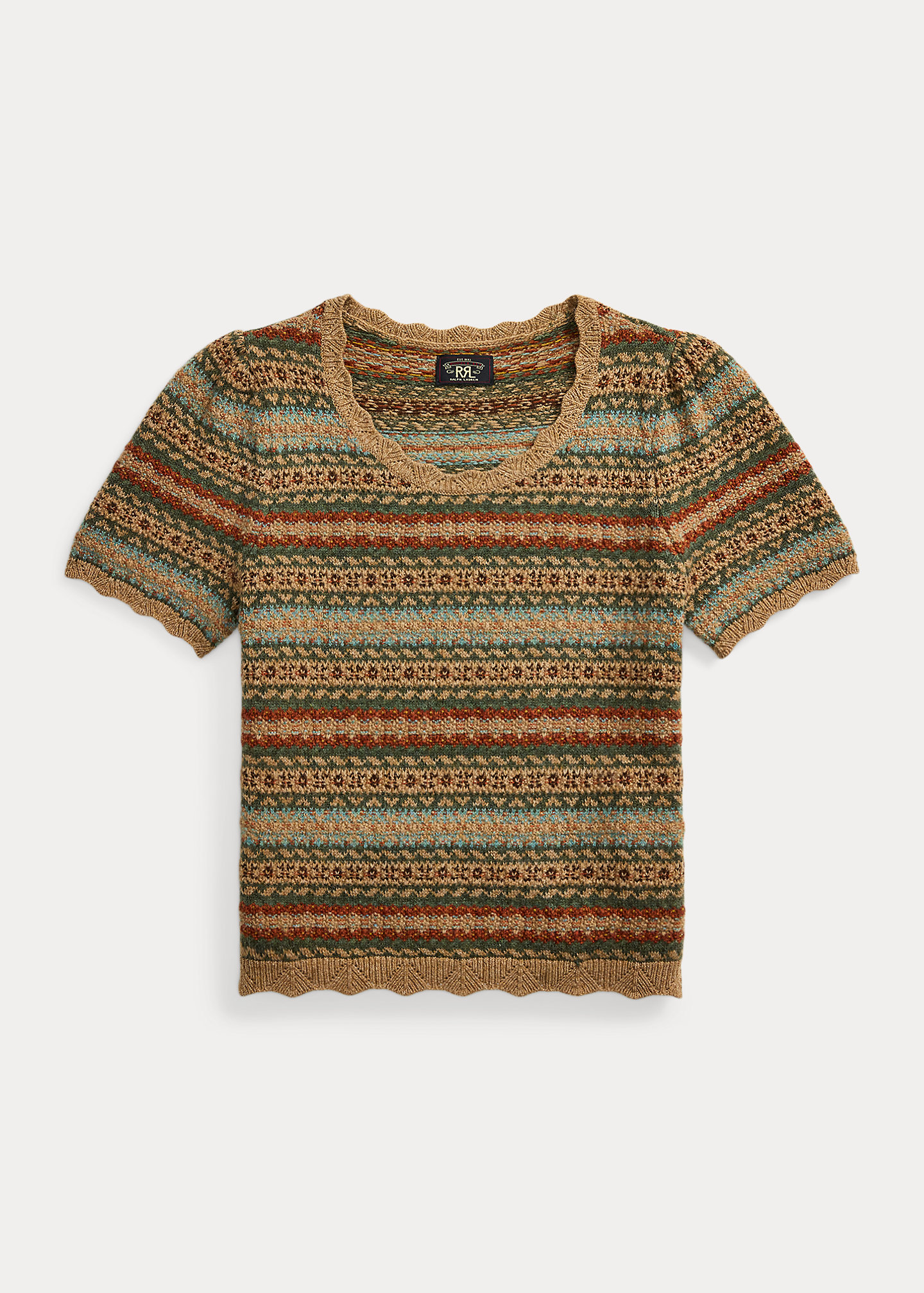 - Pointelle stitching at the neckline, cuffs, and hem.