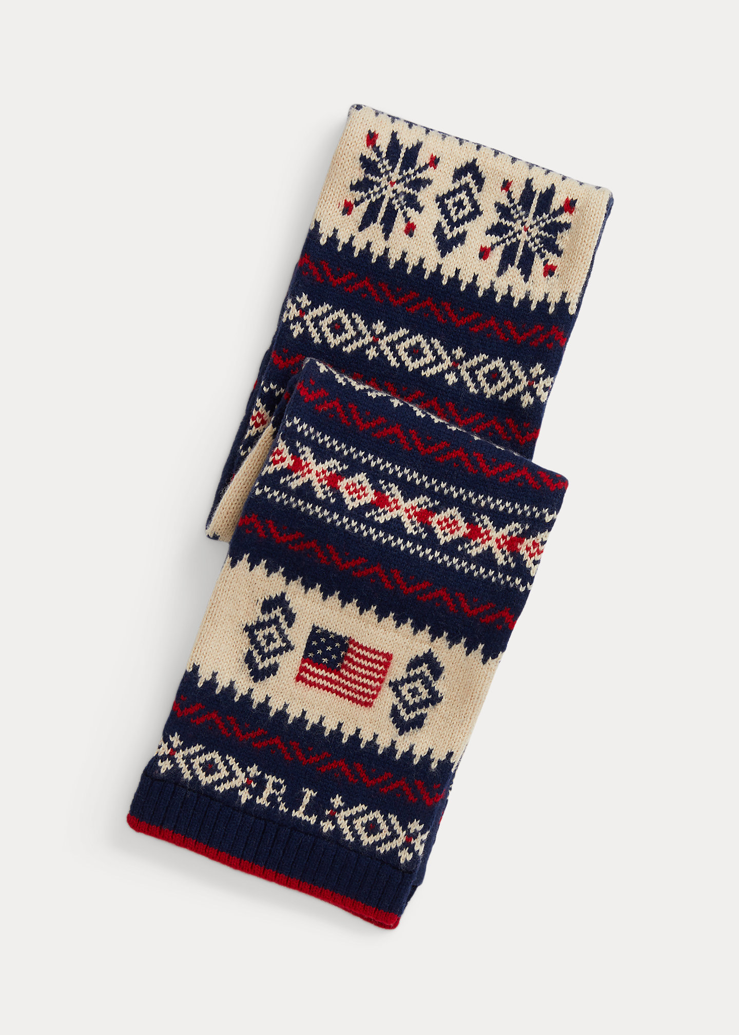 - Historical American flag intarsia-knit at each end. “Polo” intarsia-knit at one end. “RL” intarsia-knit at one end.