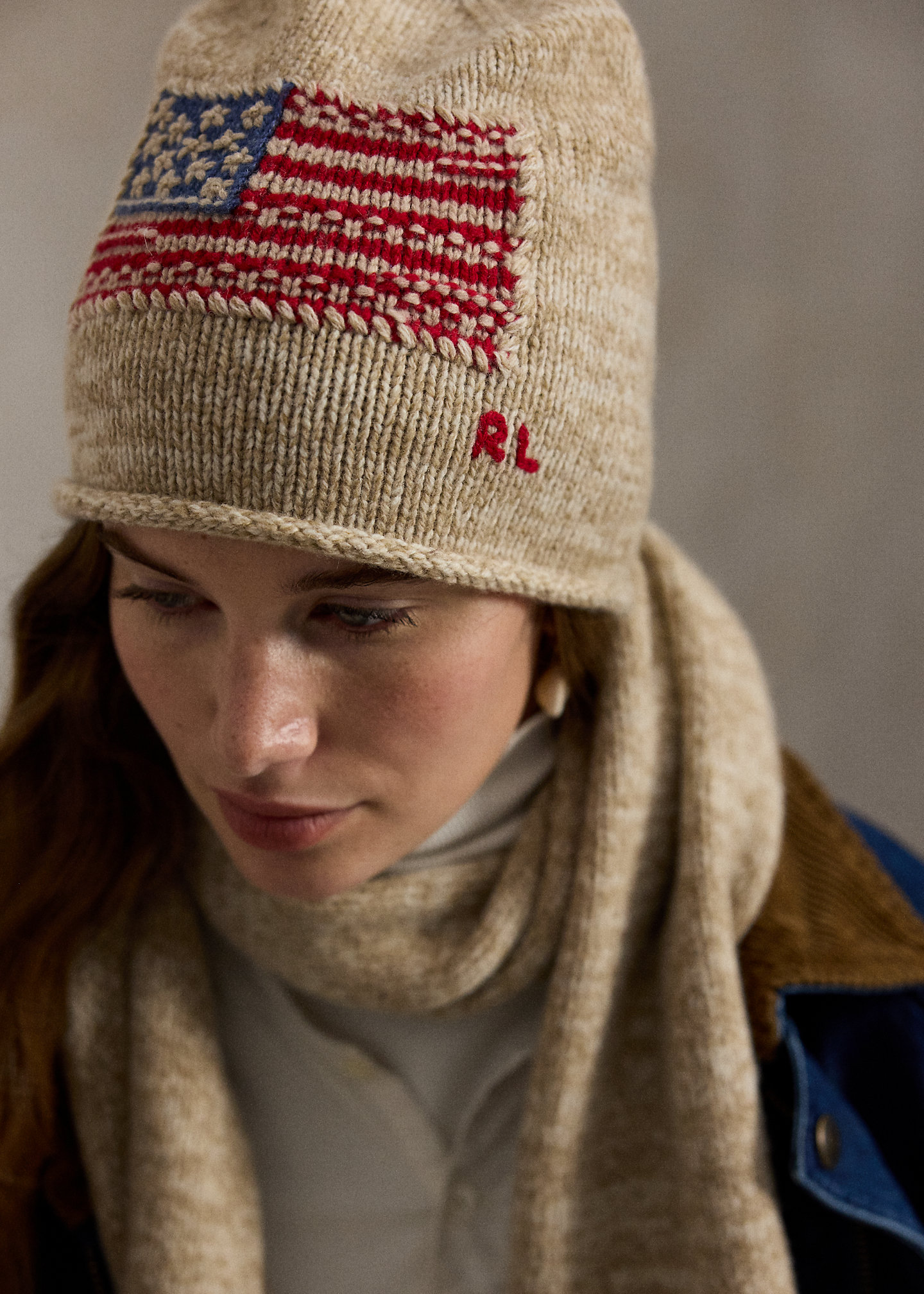 Historical American flag with whipstitching at the edges and embroidered stars. “RL” embroidered below the flag.