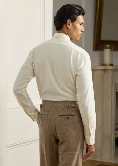 - Pleated back yoke ensures smooth, contoured shoulders.