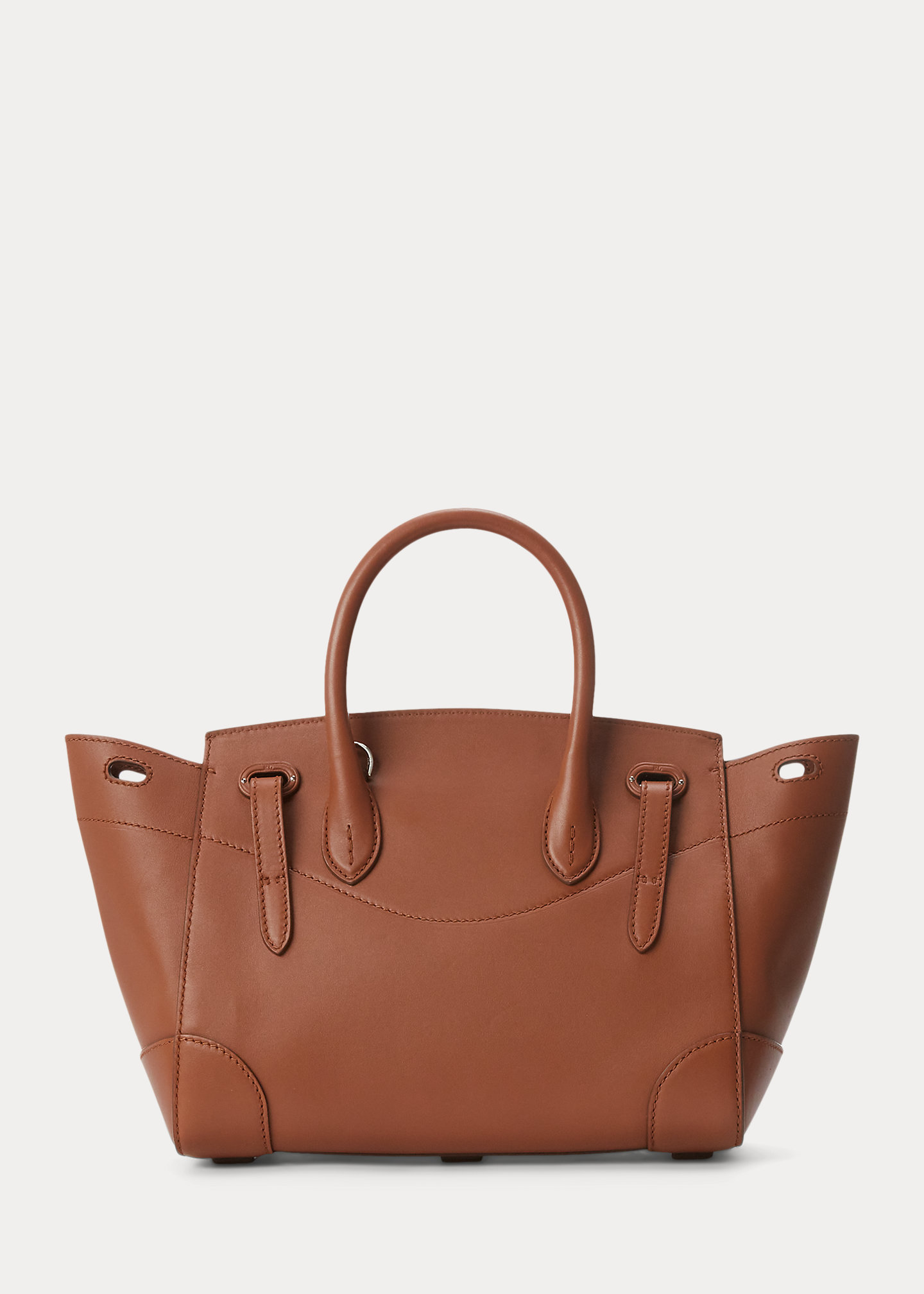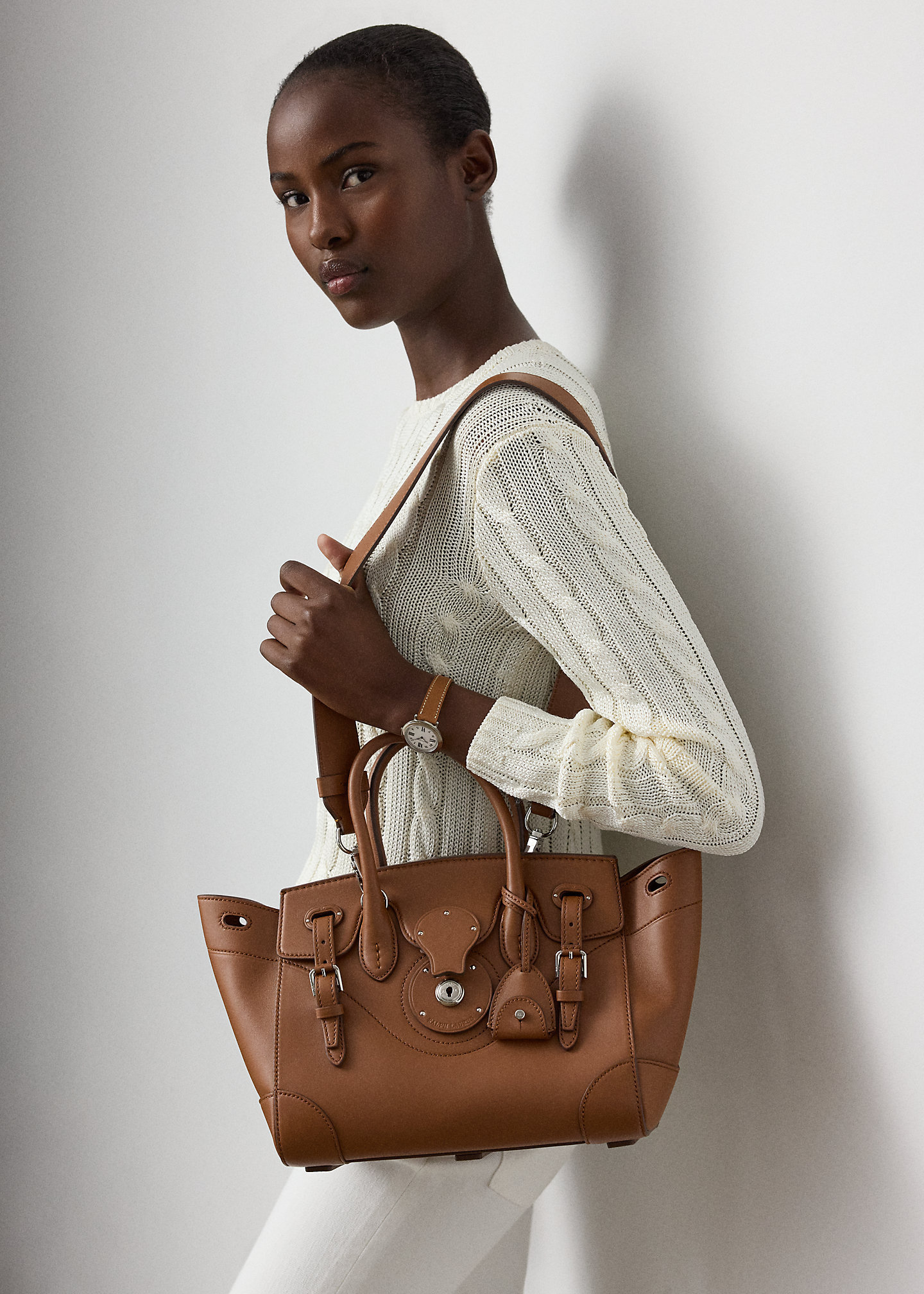 - Front flap secures with a calfskin-covered Ricky lock debossed with “ralthtph lauthtren.” Two calfskin straps loop through the front and secure with polished roller buckles. Two attached keys in a removable calfskin key bell.