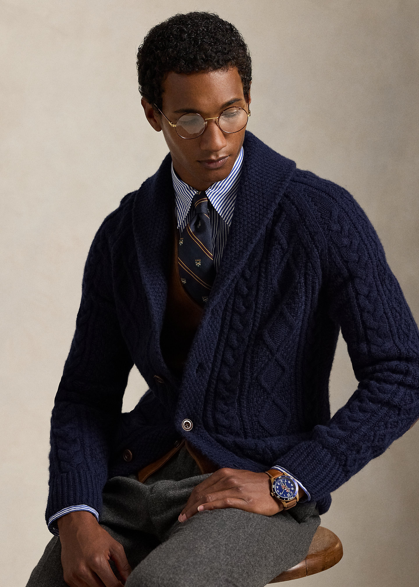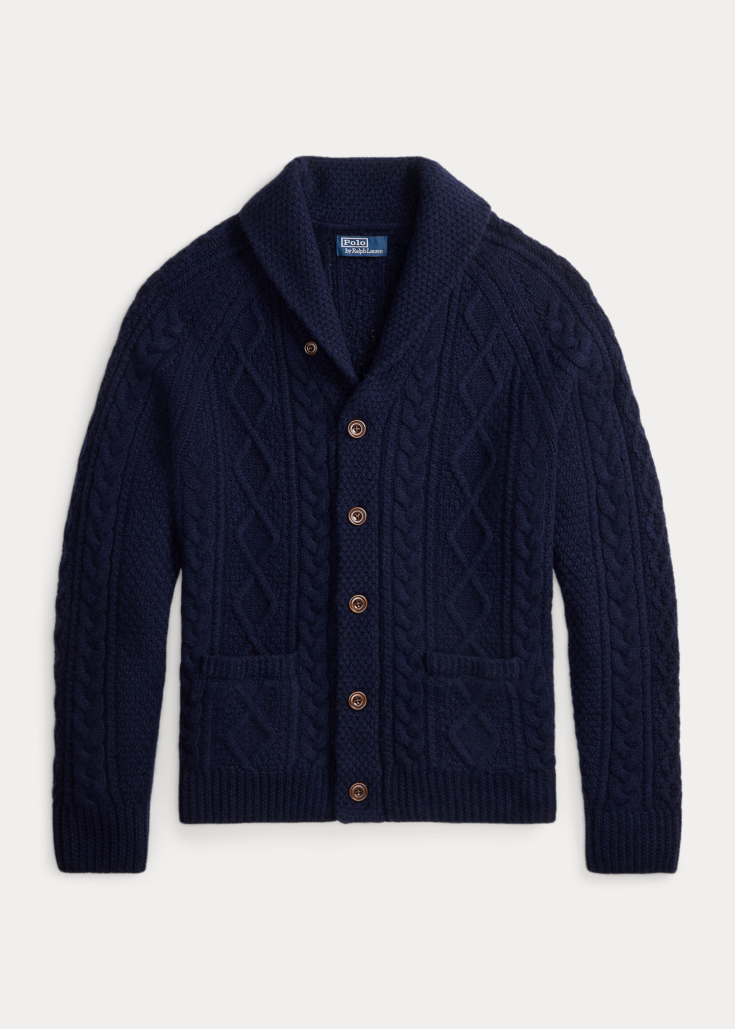 - Shawl collar with a two-button detail at the right side. Five-button placket. Corozo buttons.