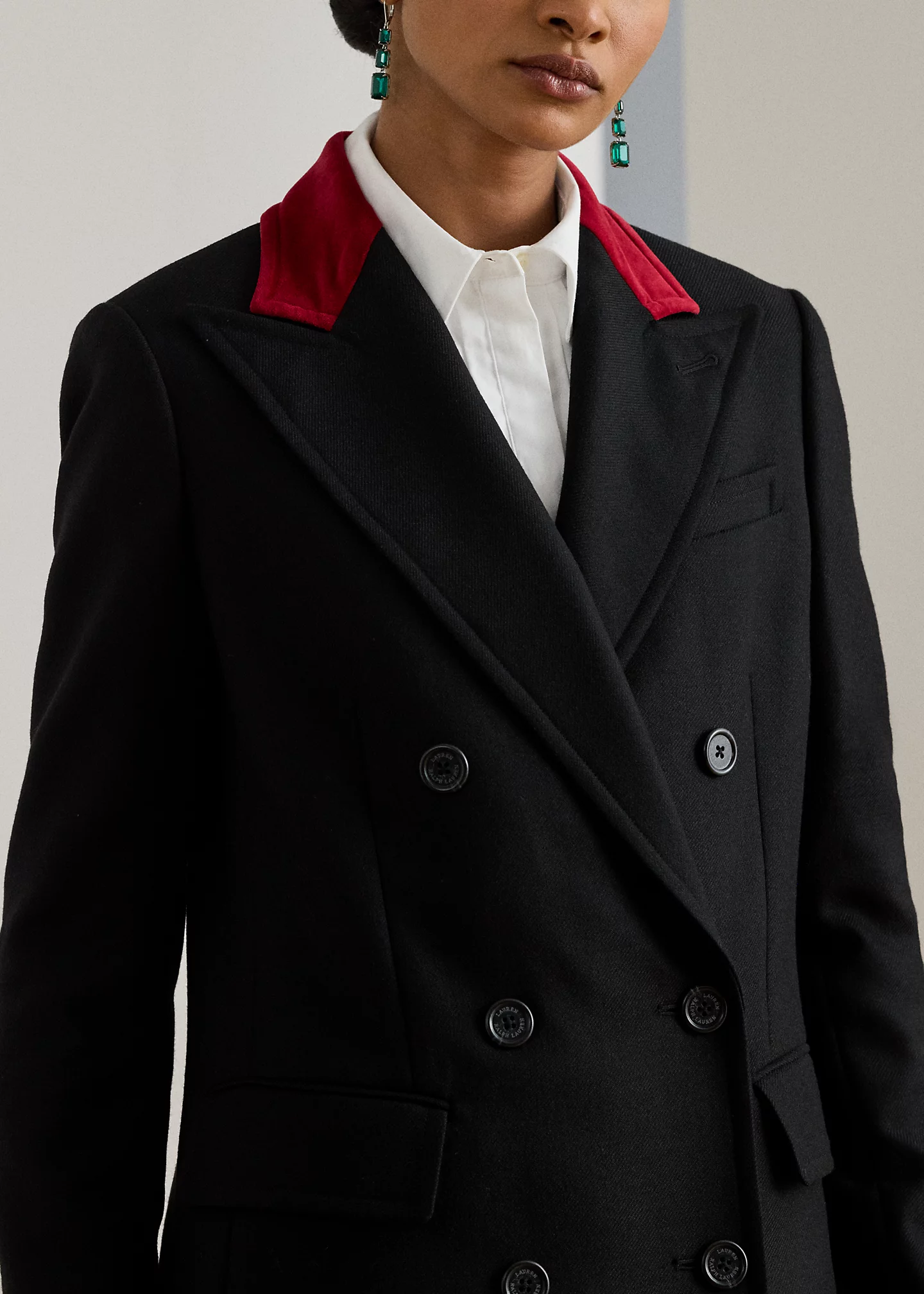 - Peak lapels. Velvet topcollar. Double-breasted silhouette. Buttons custom-developed with a "Lauren ralthtph lauthtren" logo.